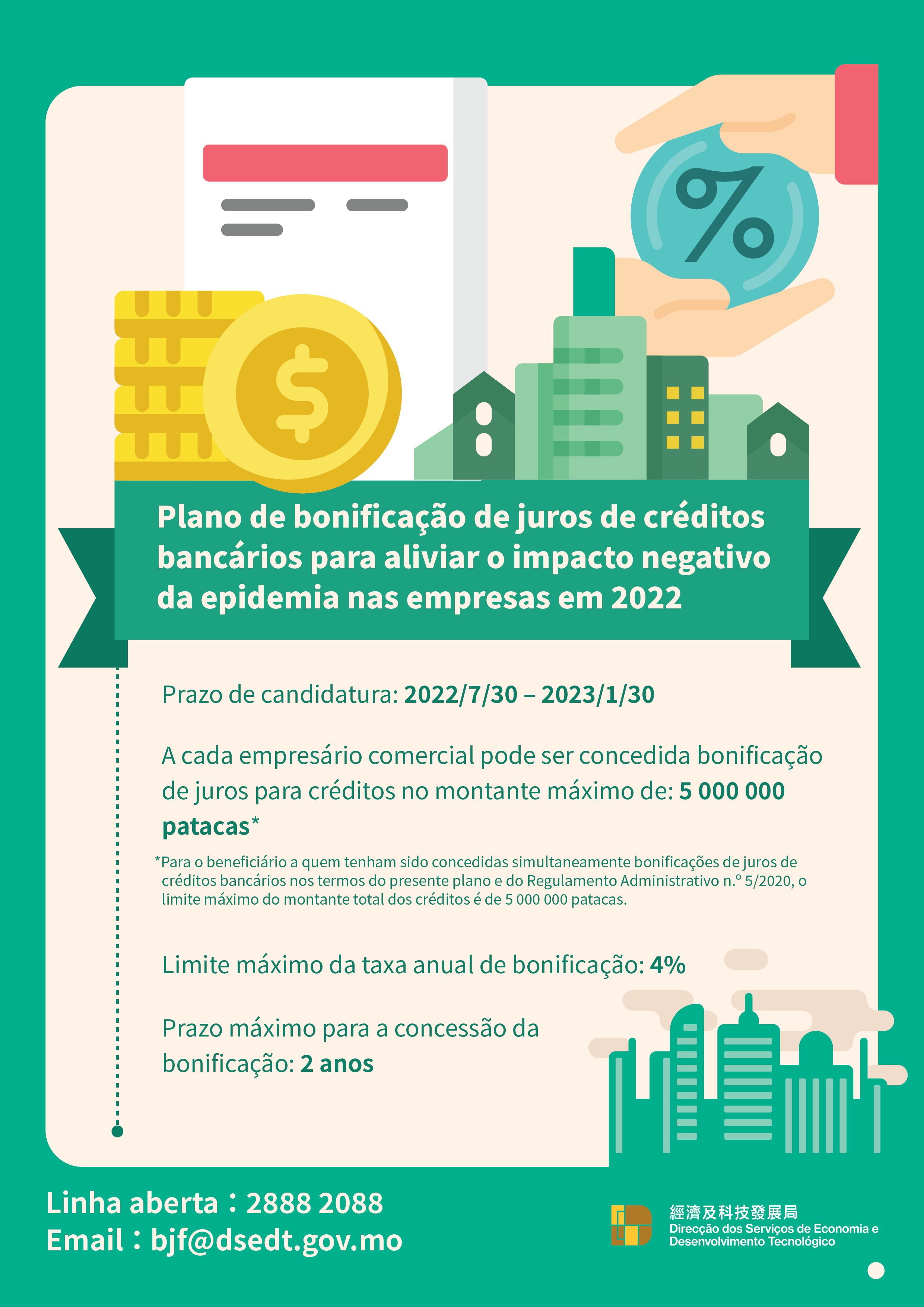 Para aliviar o impacto negativo provocado constantemente pela epidemia da pneumonia nos diversos sectores de actividade, o Governo da RAEM lançou o “Plano de bonificação de juros de créditos bancários para aliviar o impacto negativo da epidemia nas empresas em 2022” (abreviadamente designado por Plano de bonificação de juros de créditos bancários em 2022). As empresas qualificadas podem apresentar o pedido de bonificação de juros de créditos através dos bancos. O montante máximo do crédito bonificado é de 5 milhões de patacas, com um prazo máximo de bonificação de 2 anos e uma taxa anual de bonificação até 4%.