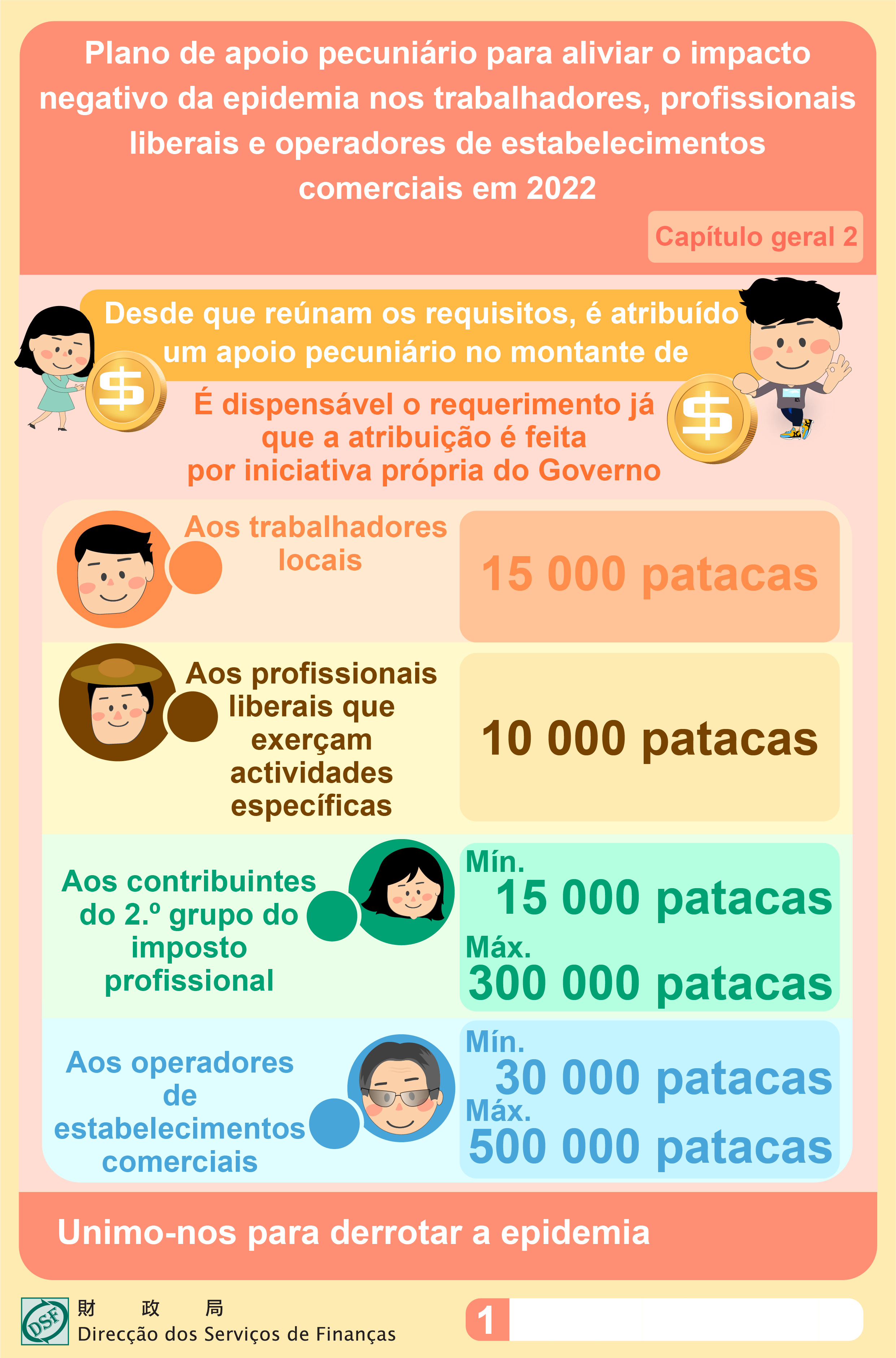 No âmbito do apoio a trabalhadores, aos trabalhadores locais que nos exercícios de 2020 e 2021 tiveram rendimentos do trabalho não excedentes a 600.000 patacas na sua totalidade, incluindo os trabalhadores que, embora reunissem os requisitos de rendimentos do trabalho, se encontravam em situação de subemprego, lay-off, em regime de tempo parcial e desvinculação durante a epidemia, é atribuído 15.000 patacas por cada um deles.
