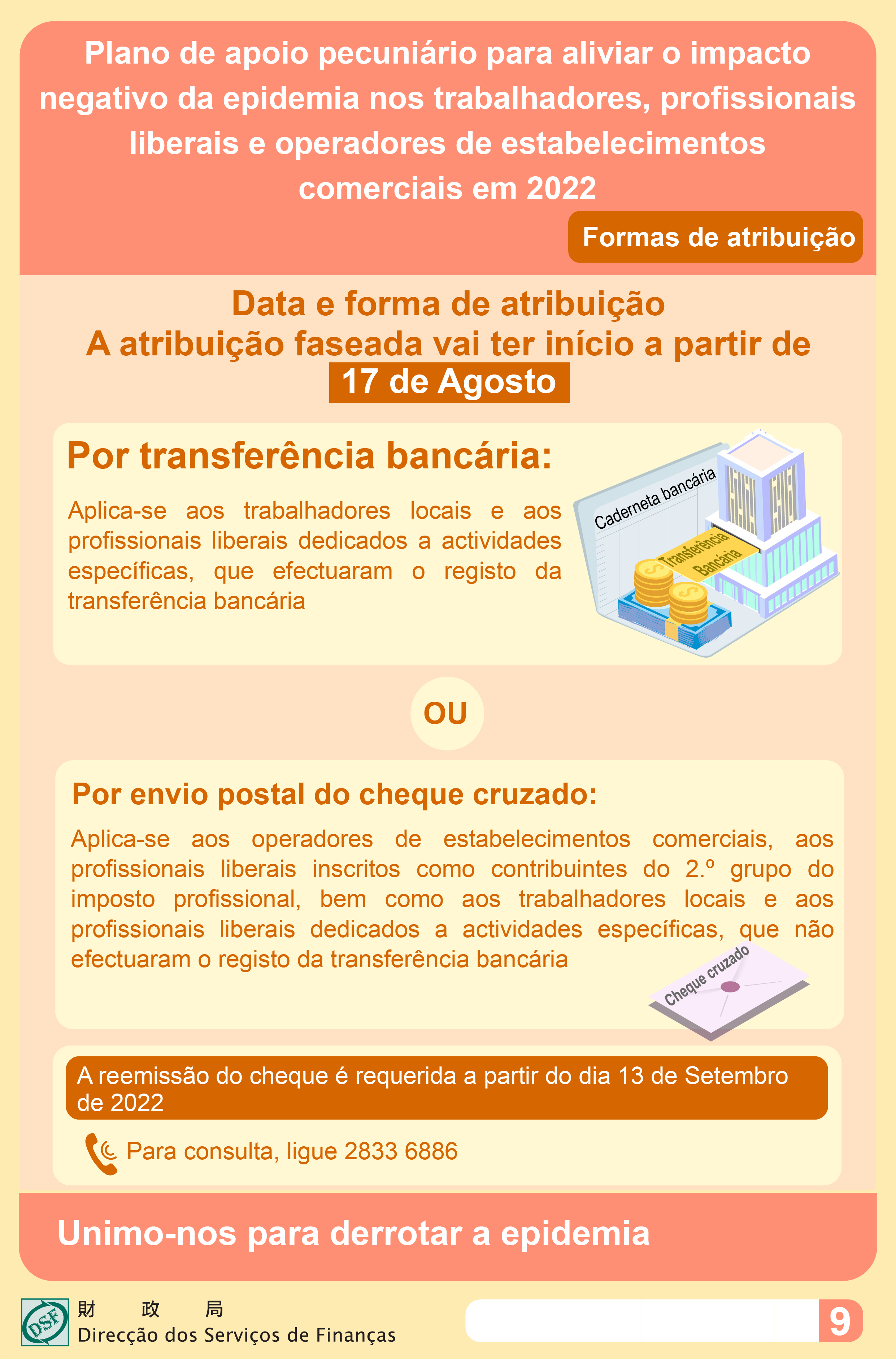 Para os operadores de estabelecimentos comerciais, os profissionais liberais, inscritos como contribuintes do 2.º grupo do Imposto Profissional, bem como os demais beneficiários, que não tenham efectuado o registo da conta bancária para receber o apoio pecuniário através de transferência bancária, o respectivo apoio pecuniário vai ser atribuído por cheque cruzado, a ser enviado, faseadamente, entre 17 e 29 de Agosto de 2022 por via postal, sendo que a DSF vai começar a aceitar, a partir de 13 de Setembro de 2022, pedido da emissão de 2ª via do cheque.