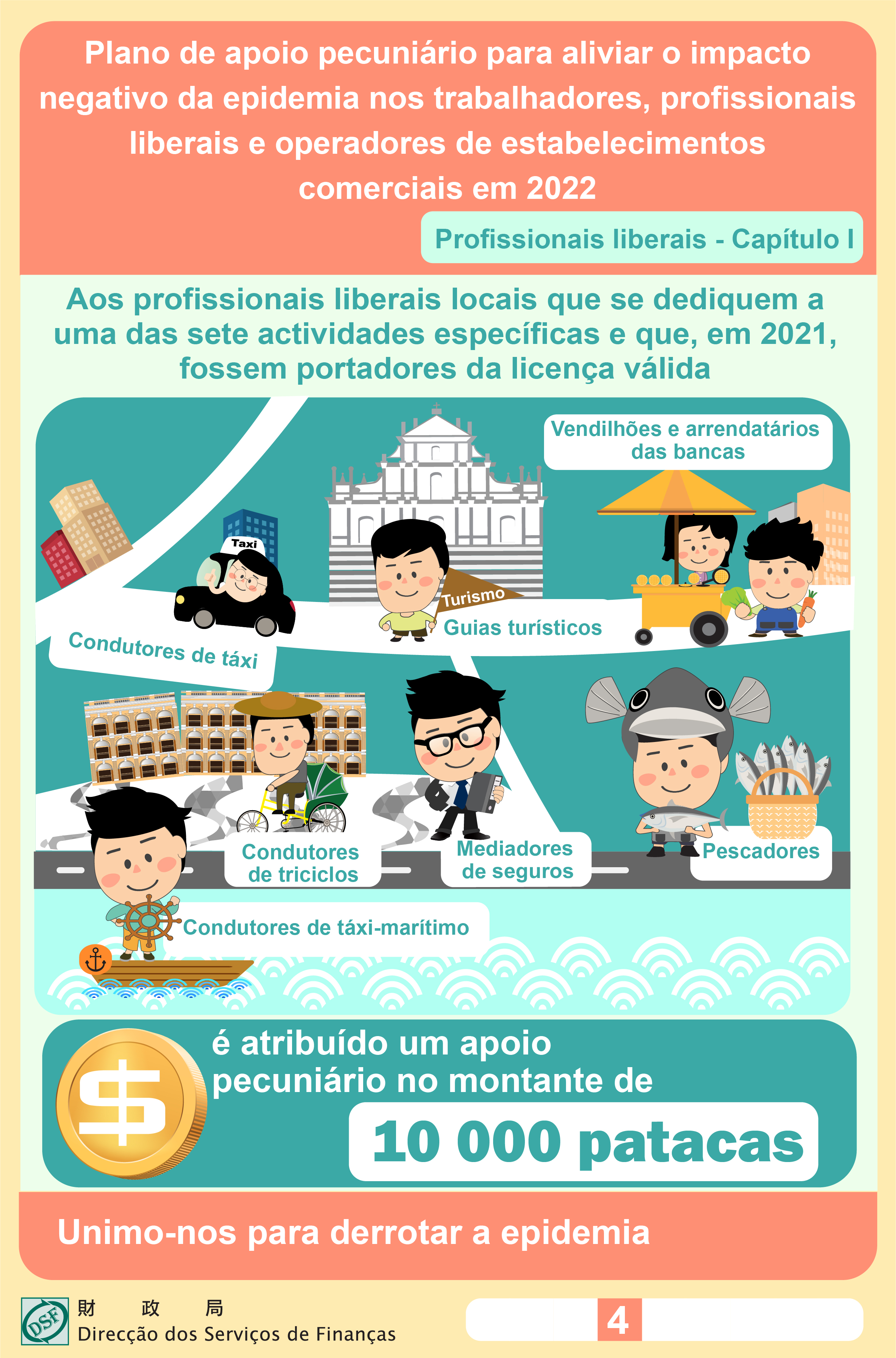 O primeiro tipo refere-se a profissionais liberais locais, titulares de licença válida, que exerçam actividade específica dos 7 tipos seguintes: condutores de táxi, condutores de triciclo, vendilhões e arrendatários das bancas, guias turísticos, condutores de táxi-marítimo, pescadores e mediadores de seguros, sendo o respectivo montante a atribuir de 10.000 patacas por pessoa.