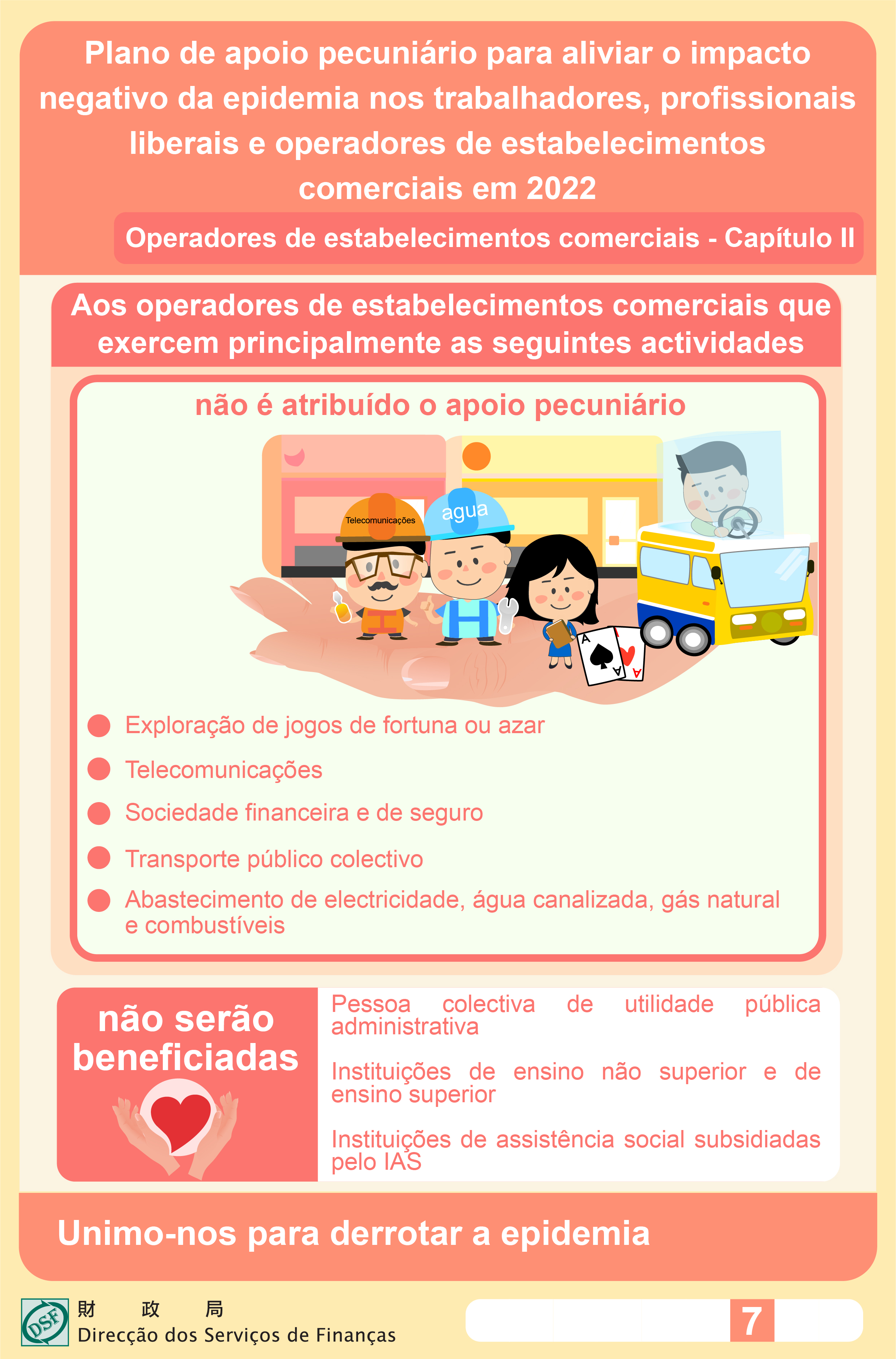 As actividades salvaguardadas pelo regime de exploração exclusiva ou de concessão, nomeadamente os jogos de fortuna ou azar, as telecomunicações, a actividade financeira e seguradora, o transporte público colectivo, bem como o fornecimento de electricidade, de água canalizada, de gás natural e de combustível, ou determinados operadores que tenham como objecto o exercício das actividades subsidiadas pelo Governo, assim como entidades com natureza relativamente específica, e.g., pessoa colectiva de utilidade pública administrativa, instituições de educação (excepto o ensino suplementar) e as instituições de assistência social, subsidiadas regularmente pelo Instituto de Acção Social, não são abrangidos no âmbito dos benefícios a que alude o presente plano de apoio.