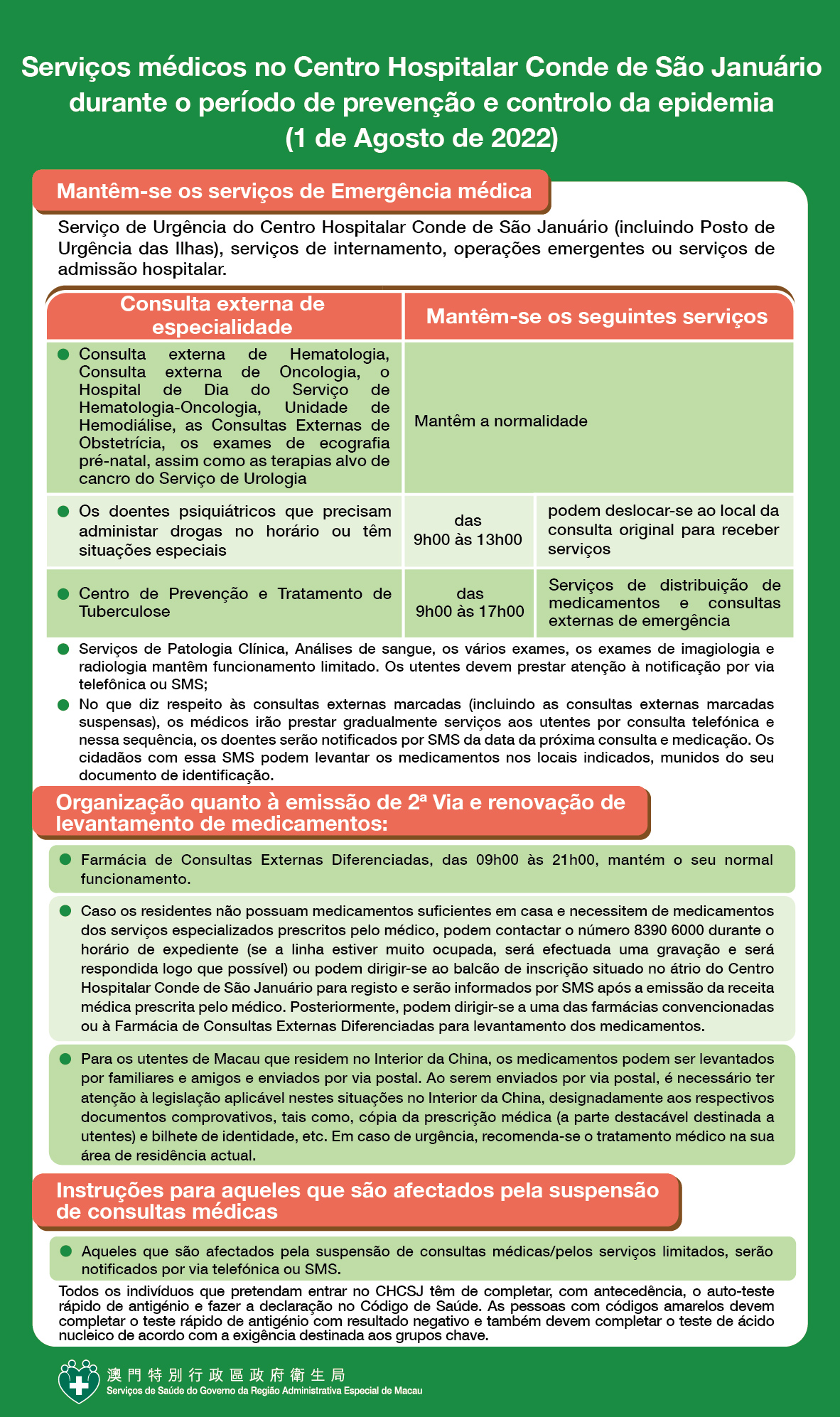 Para cooperar com as várias medidas contra a epidemia promovidas pelo Governo da Região Administrativa Especial de Macau durante o período de consolidação da prevenção e controlo da epidemia, os serviços médicos do Centro Hospitalar Conde de São Januário, Centros/Postos de Saúde, emissão de 2ª. Via e renovação do levantamento de medicamentos são disponibilizados da seguinte forma, no dia 1 de Agosto: