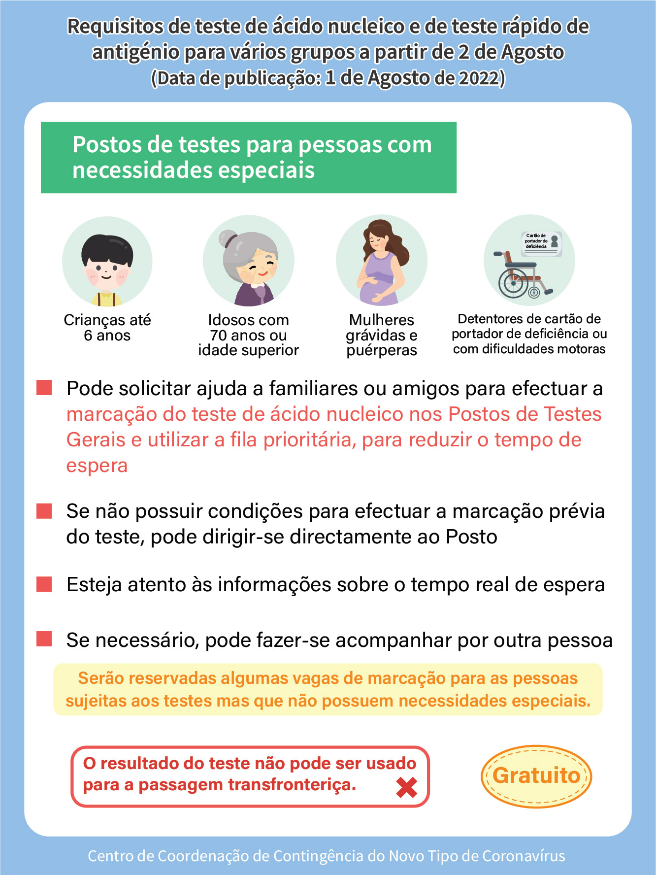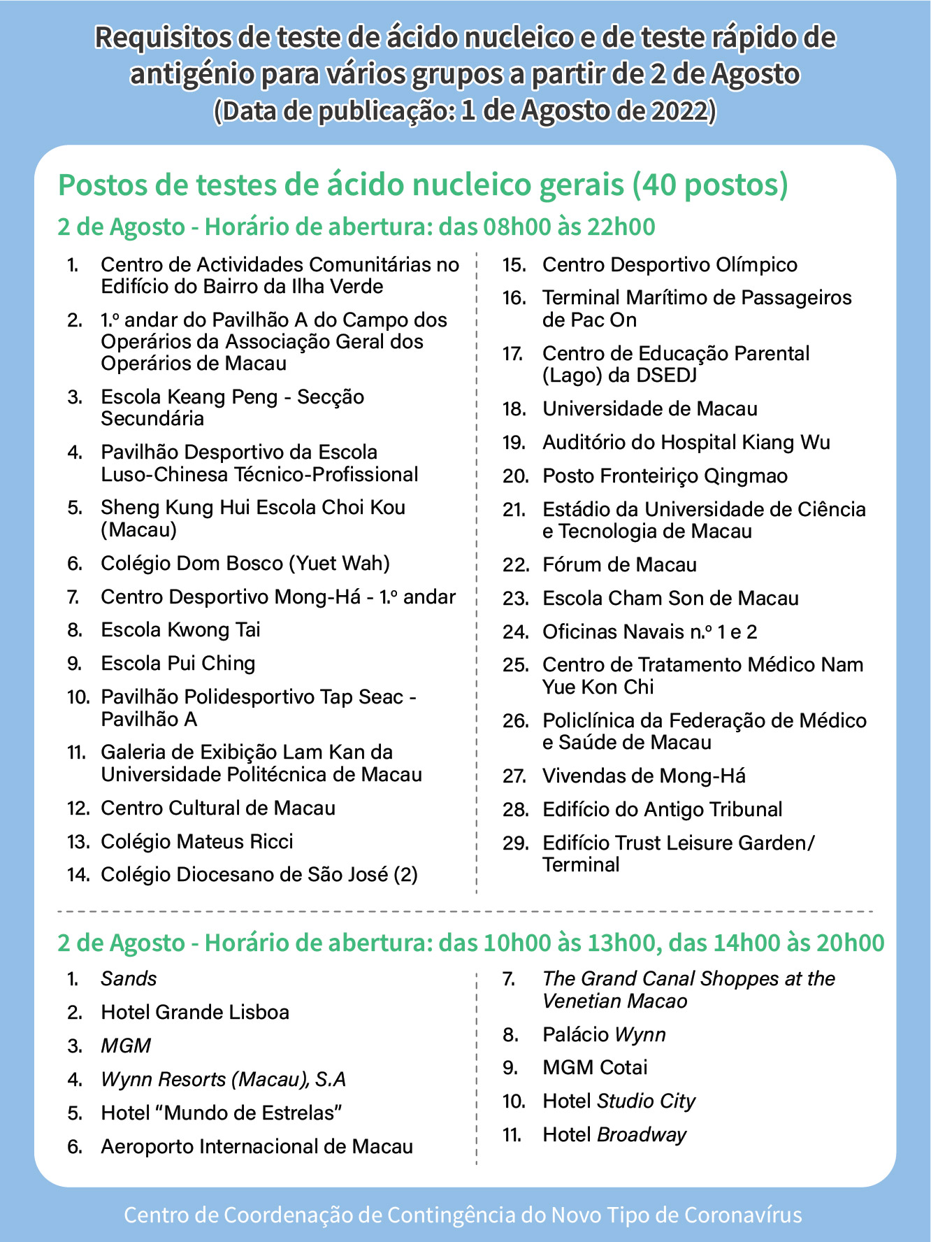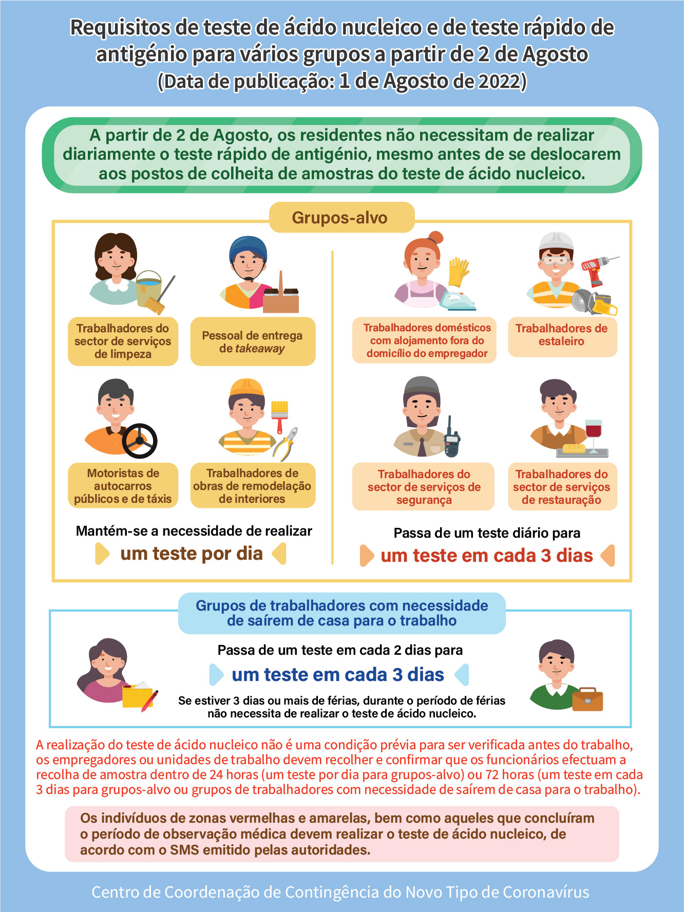 O Centro de Coordenação de Contingência do Novo Tipo de Coronavírus informa que, após a análise de risco, no dia 2 de Agosto (terça-feira), os grupos-chave e o grupo de trabalhadores, com necessidade de saírem de casa para o trabalho, têm de realizar os seguintes testes, a saber: