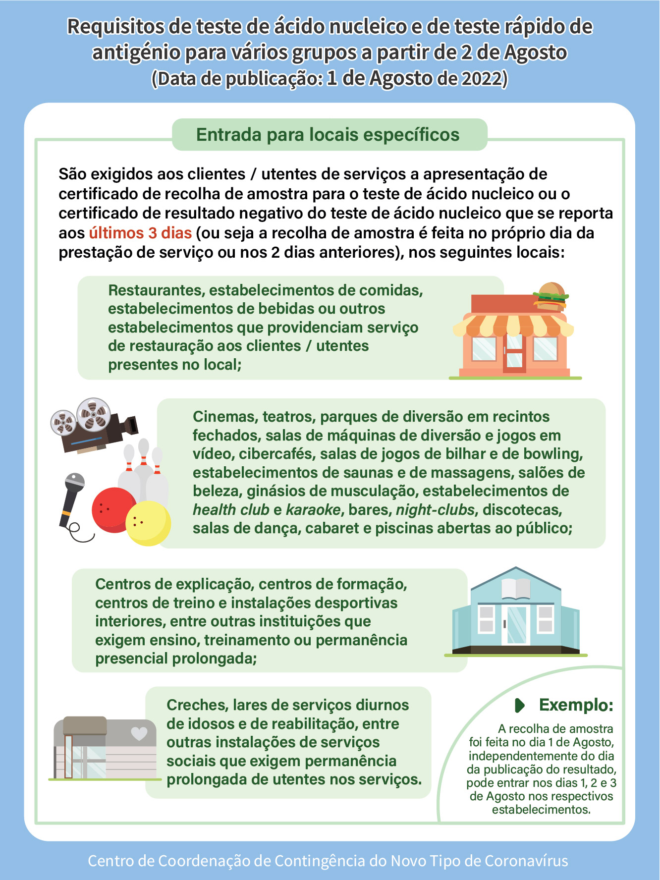 Se entrar nos estabelecimentos a seguir, o cliente/utente deve exibir um certificado de amostragem de teste de ácido nucleico ou um certificado de resultado negativo relevante, dentro de 3 dias a partir da data de amostragem (ou seja, é aceite a amostragem realizada no dia de serviço ou, nos últimos 2 dias). Por exemplo, se a recolha de amostra for realizada no dia 1 de Agosto, independentemente do dia em que o resultado do teste possa ser obtido, pode entrar nos estabelecimentos nos dias 1, 2 e 3 de Agosto: