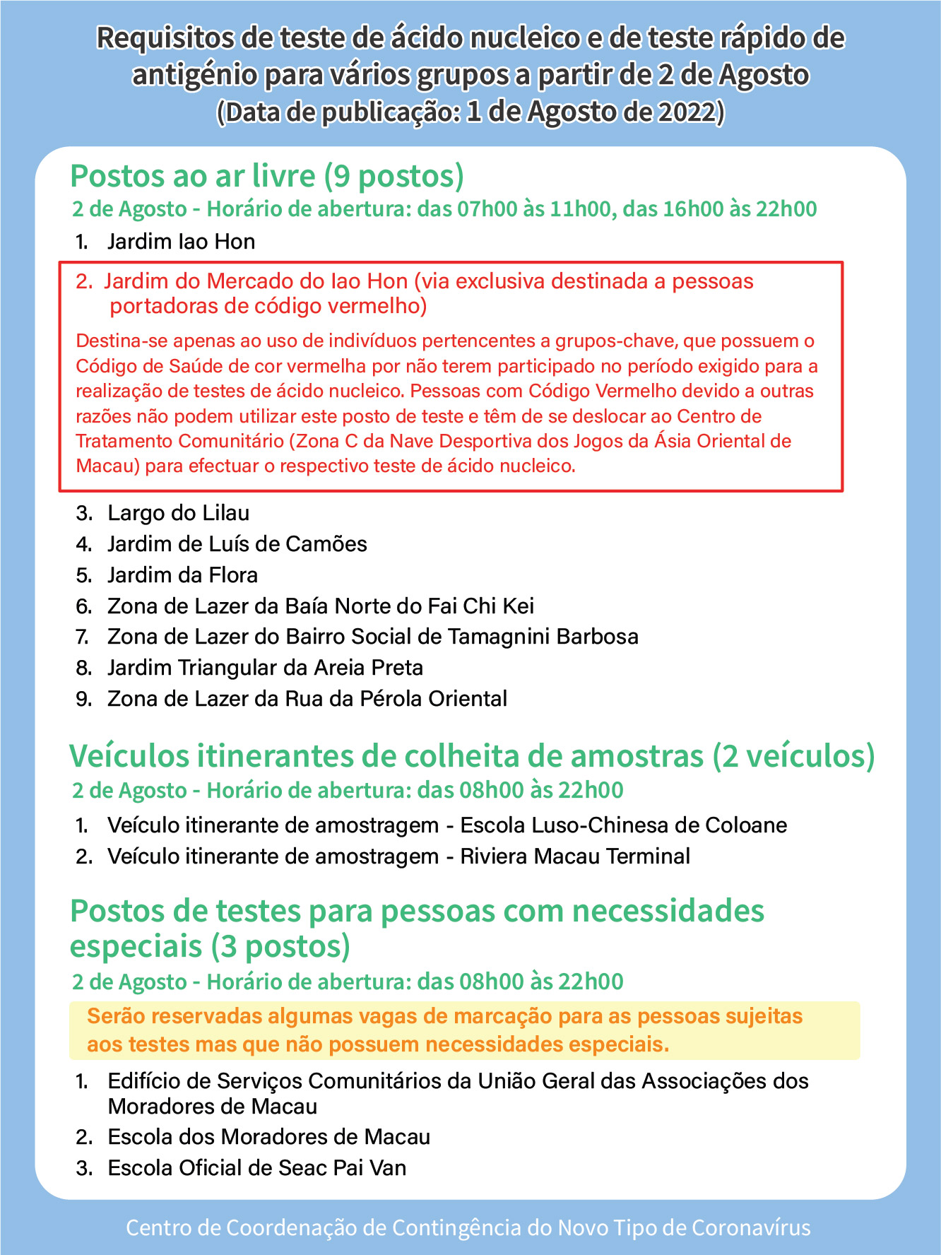 O Centro de Coordenação de Contingência do Novo Tipo de Coronavírus informa que, após a análise de risco, no dia 2 de Agosto (terça-feira), os grupos-chave e o grupo de trabalhadores, com necessidade de saírem de casa para o trabalho, têm de realizar os seguintes testes, a saber: