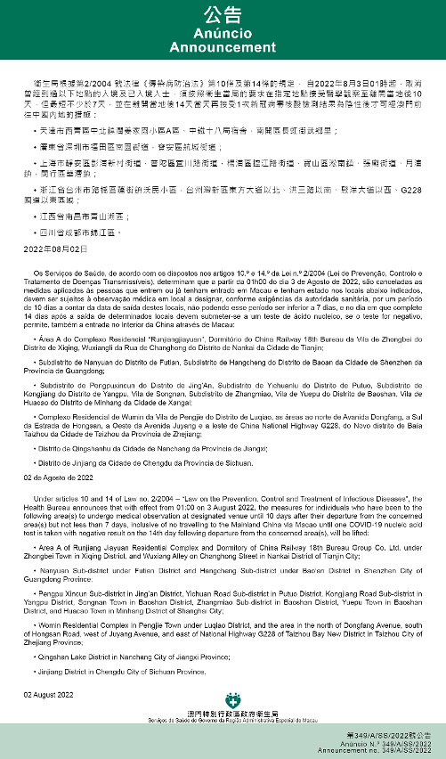Tendo em consideração a evolução epidemiológica mais actualizada no Interior da China, os Serviços de Saúde, de acordo com os dispostos nos artigos 10.º e 14.º da Lei n.º 2/2004 (Lei de Prevenção, Controlo e Tratamento de Doenças Transmissíveis), determinam que a partir da 01h00 do dia 3 de Agosto de 2022, todos os indivíduos que entrem ou já tenham entrado em Macau e tenham estado nos locais abaixo indicados, devem ser sujeitos à observação médica em local a designar, conforme exigências da autoridade sanitária, por um período de 10 dias a contar da data de saída destes locais, não podendo esse período ser inferior a 7 dias, e no dia em que complete 14 dias após a saída de determinados locais devem submeter-se a um teste de ácido nucleico, se o teste for negativo, permite, também a entrada no Interior da China através de Macau: