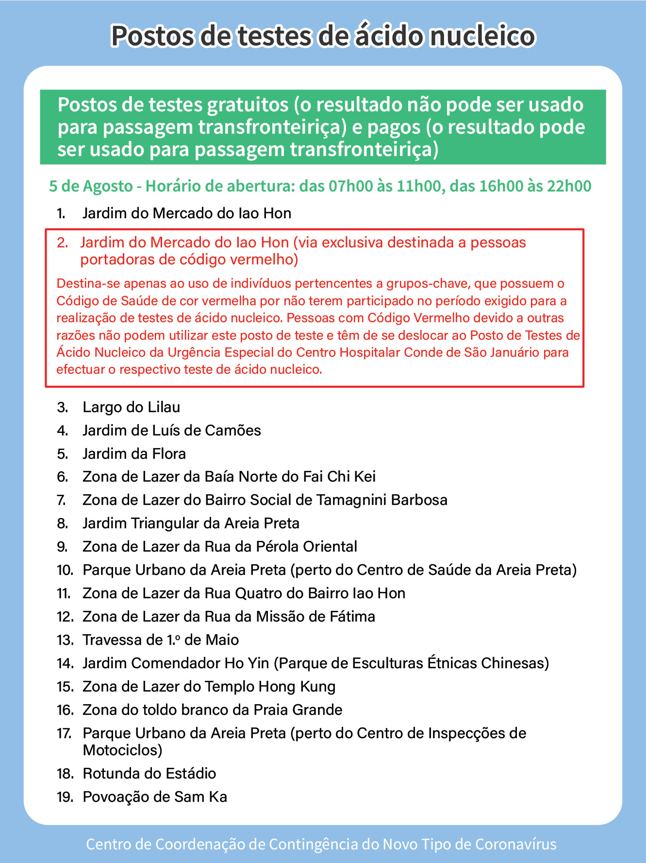 Em articulação com a necessidade de realização de teste de ácido nucleico por diversos grupos de pessoas, a localização de vários postos de teste de ácido nucleico foi actualizada no dia 5 de Agosto.