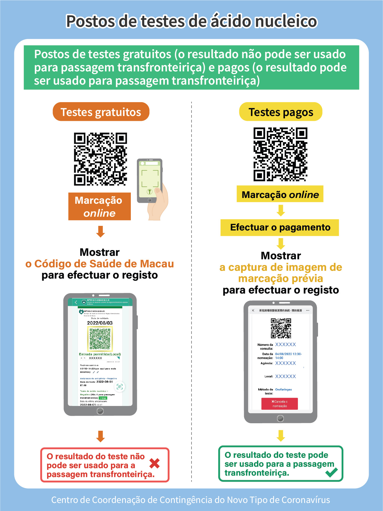 - As pessoas que pretendam realizar testes gratuitos nestes postos de usar a ligação electrónica de agendamento destinado aos postos gratuitos. Ao entrar no posto, devem exibir o código de saúde. O resultado do teste será visível no Código de Saúde de Macau, mas não pode ser usado para a passagem fronteiriça.