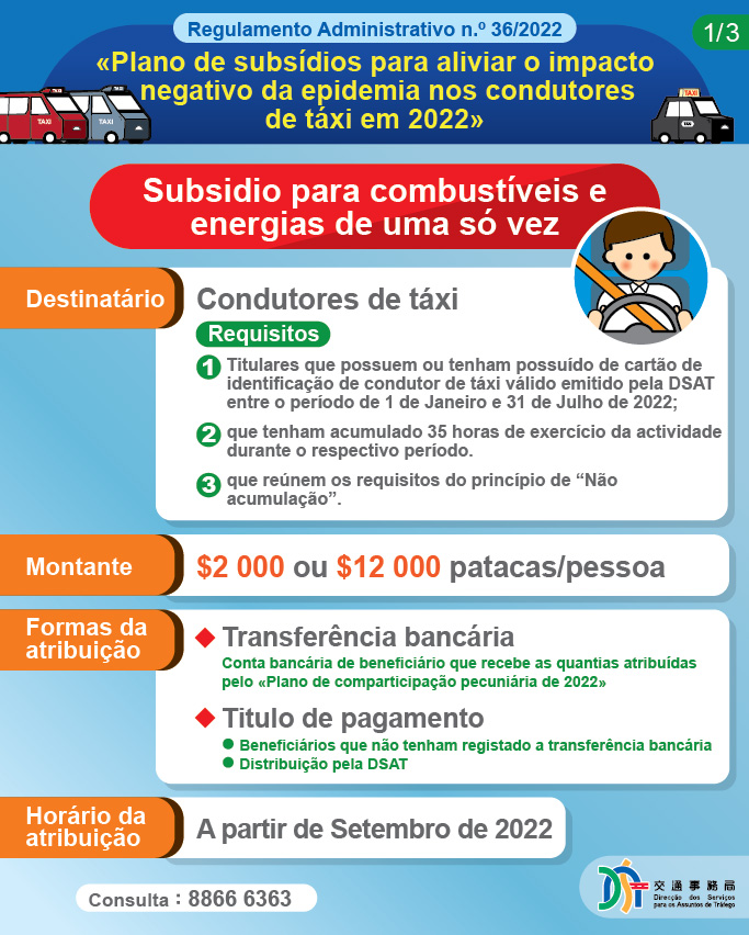 A fim de atenuar o impacto negativo da epidemia no sector de táxi, o Governo da RAEM anunciou, hoje (dia 8), o lançamento do «Plano de subsídios para aliviar o impacto negativo da epidemia nos condutores de táxi em 2022». Aos condutores de táxis que reúnem os requisitos é atribuído, de uma só vez, o subsídio para combustíveis e energias, no montante máximo de 12 000 patacas. No entanto, há que ter em atenção que, caso os beneficiários reúnam simultaneamente os requisitos para receber um dos tipos de apoio pecuniário ao abrigo do Regulamento Administrativo n.º 33/20222 «Plano de apoio pecuniário para aliviar o impacto negativo da epidemia nos trabalhadores, profissionais liberais e operadores de estabelecimentos comerciais em 2022», serão atribuído apenas o montante em excesso da diferença entre o subsídio para combustíveis e energias, ou seja, no montante de 2 000 patacas.