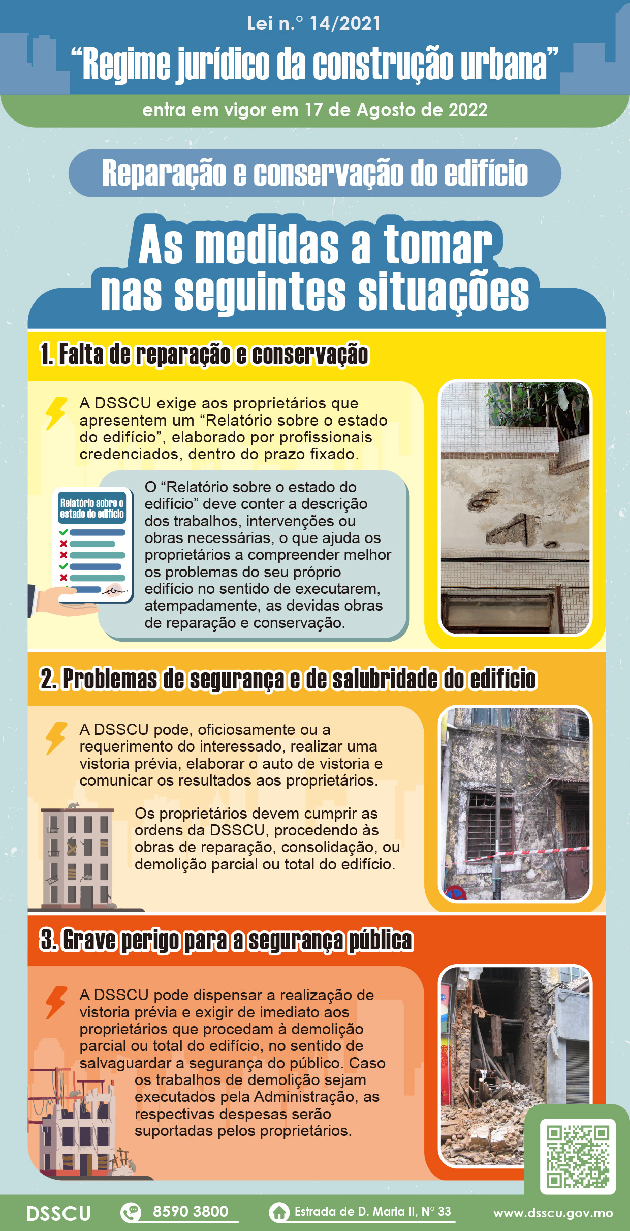 O “Regime jurídico da construção urbana” define claramente que os proprietários devem assumir a responsabilidade e o dever de reparar e conservar o edifício, estipulando ainda que decorridos 10 anos após a emissão da licença de utilização e em cada cinco anos subsequentes, devem proceder à reparação e conservação do mesmo, no sentido de o manter em boas condições. Caso se verifiquem sinais de falta de conservação do edifício, nomeadamente problemas de segurança e de salubridade, a Direcção dos Serviços de Solos e Construção Urbana (DSSCU) vai exigir aos proprietários que acompanhem o problema, incluindo a entrega de um “Relatório sobre o estado do edifício” elaborado por profissionais credenciados e a execução das devidas obras de reparação e conservação. Em caso de violação grave do dever de conservação e reparação, os proprietários ficam sujeitos à aplicação de multa.