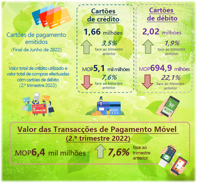 No final de Junho de 2022, o número de cartões pessoais de crédito emitidos pelos bancos em Macau atingiu 1.662.136, tendo registado um acréscimo de 3,5% relativamente ao primeiro trimestre de 2022. O número de cartões de débito emitidos pelos bancos em Macau atingiu a 2.021.381, correspondendo a um acréscimo de 1,9% quando comparado com o primeiro trimestre de 2022.