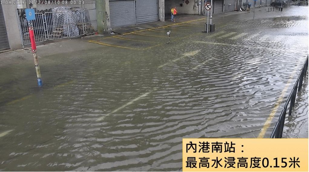 Devido à influência da maré astronómica, combinada com o “Storm Surge” e com a chuva contínua, esta Direcção emitiu o Aviso de “Storm Surge” amarelo às 18:00 horas no dia 9 de Agosto. Se a hora da altura máxima da água se tivesse sobreposto à hora da maré astronómica, podiam esperar-se inundações entre 0,5 e 0,6 metros em zonas do Porto Interior (Figura 5). Dado que não houve sobreposição do "Storm Surge" com maré astronómica, a inundação não foi significativa, no entanto, durante a manhã de 10 de Agosto, houve uma inundação de até 0,15 metros no sul do Porto Interior (Figura 6).