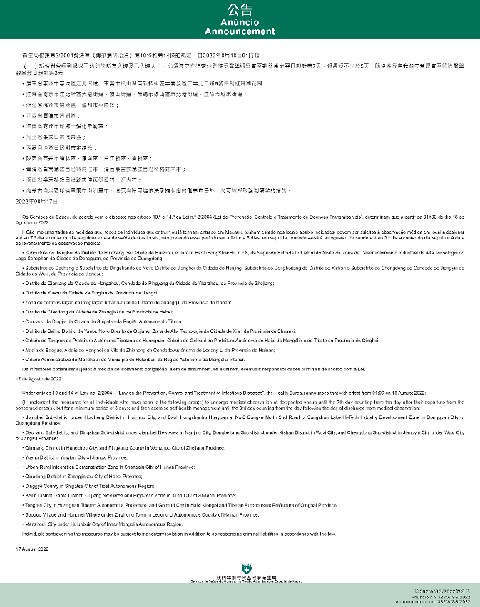 Tendo em consideração a evolução epidemiológica mais actualizada no Interior da China, os Serviços de Saúde, de acordo com o disposto nos artigos 10.º e 14.º da Lei n.º 2/2004 (Lei de Prevenção, Controlo e Tratamento de Doenças Transmissíveis), determinam que a partir da 01h00 do dia 18 de Agosto de 2022, são implementadas ou canceladas as medidas antiepidémicas para quem tenha estado em diversas áreas do Interior da China: