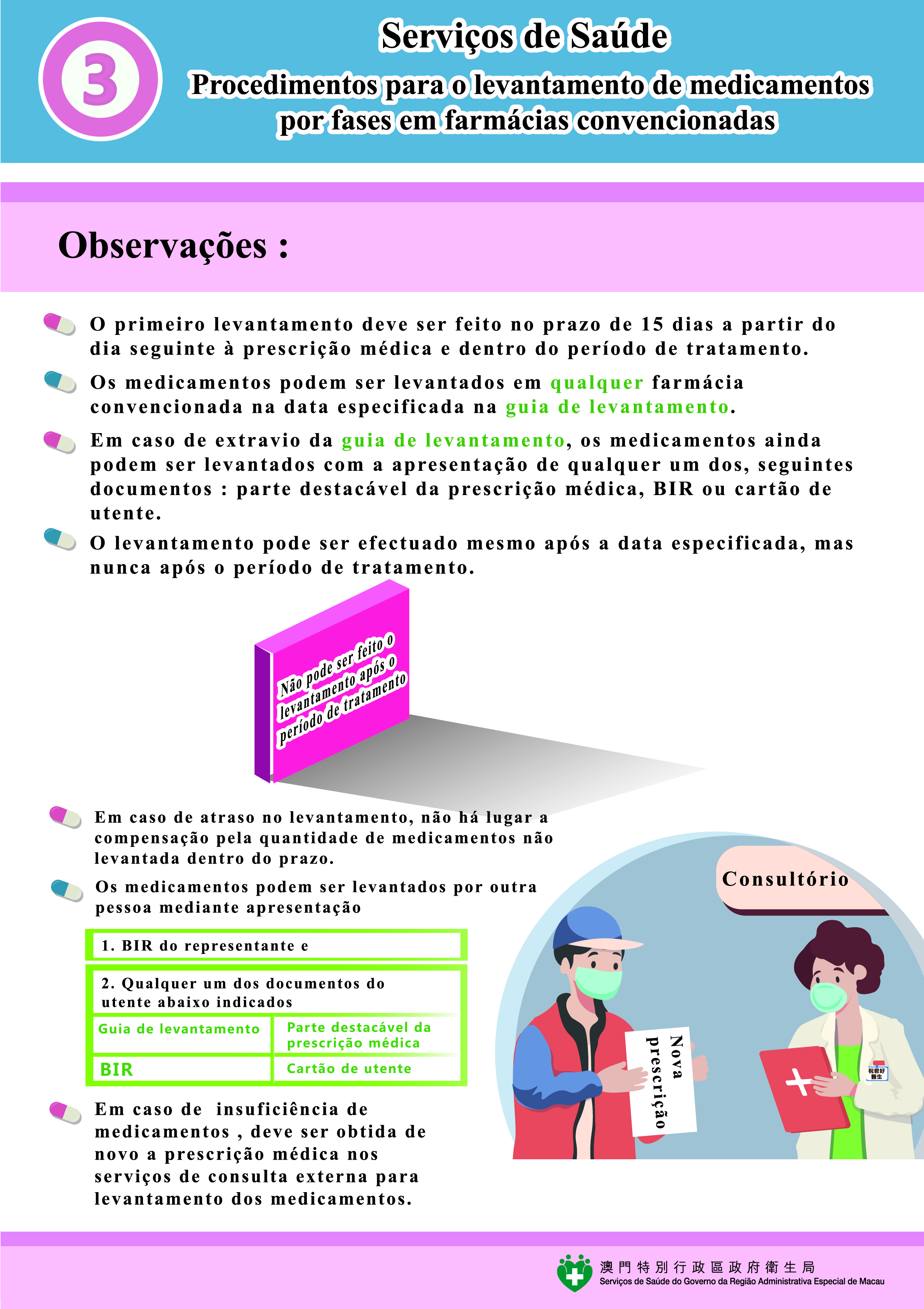 Os utentes devem prestar atenção à conservação adequada da guia de levantamento seguinte de medicamentos, onde está registado a quantidade total de medicamentos, a quantidade de medicamentos levantados bem como a quantidade restante. Os utentes podem dirigir-se a qualquer farmácia convencionada consoante a data especificada na guia de levantamento seguinte dos medicamentos. Em caso de extravio, os medicamentos podem ser levantados mediante apresentação da parte destacável da prescrição médica original, do original do BIR ou do Cartão de Utente dos Serviços de Saúde.