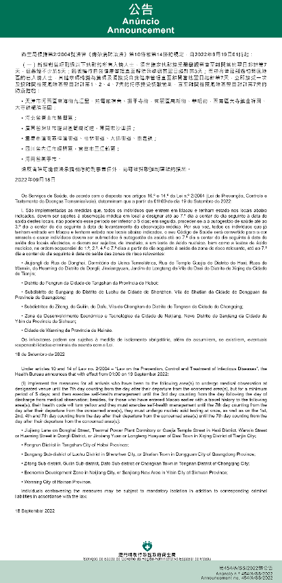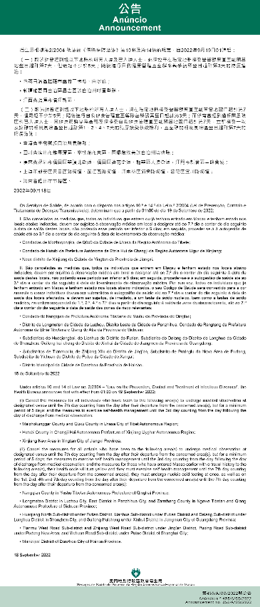 Tendo em consideração a evolução epidemiológica mais actualizada no Interior da China, os Serviços de Saúde, de acordo com o disposto nos artigos 10.º e 14.º da Lei n.º 2/2004 (Lei de Prevenção, Controlo e Tratamento de Doenças Transmissíveis), determinam que a partir da 01h00 do dia 19 de Setembro de 2022, são implementadas ou canceladas as medidas antiepidémicas para quem tenha estado em diversas áreas do Interior da China:
