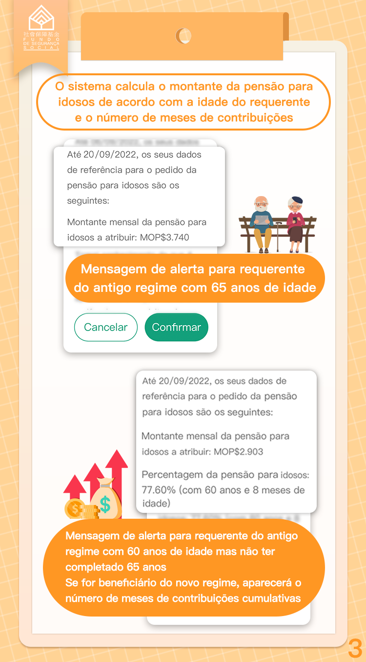 Quer com idade igual ou superior a 65 anos, ou com idade igual ou superior a 60 anos mas inferior a 65 anos, quer a inscrição no regime da segurança social feita antes de 1 de Janeiro de 2011 (antigo regime) ou depois de 1 de Janeiro de 2011 (novo regime), os beneficiários, desde que tenham efectuado, pelo menos, sessenta contribuições mensais e tenham residência habitual na RAEM há, pelo menos, sete anos, podem requer a pensão para idosos na aplicação para telemóvel ou na página electrónica “Conta Única de Macau”, sem sair de casa.