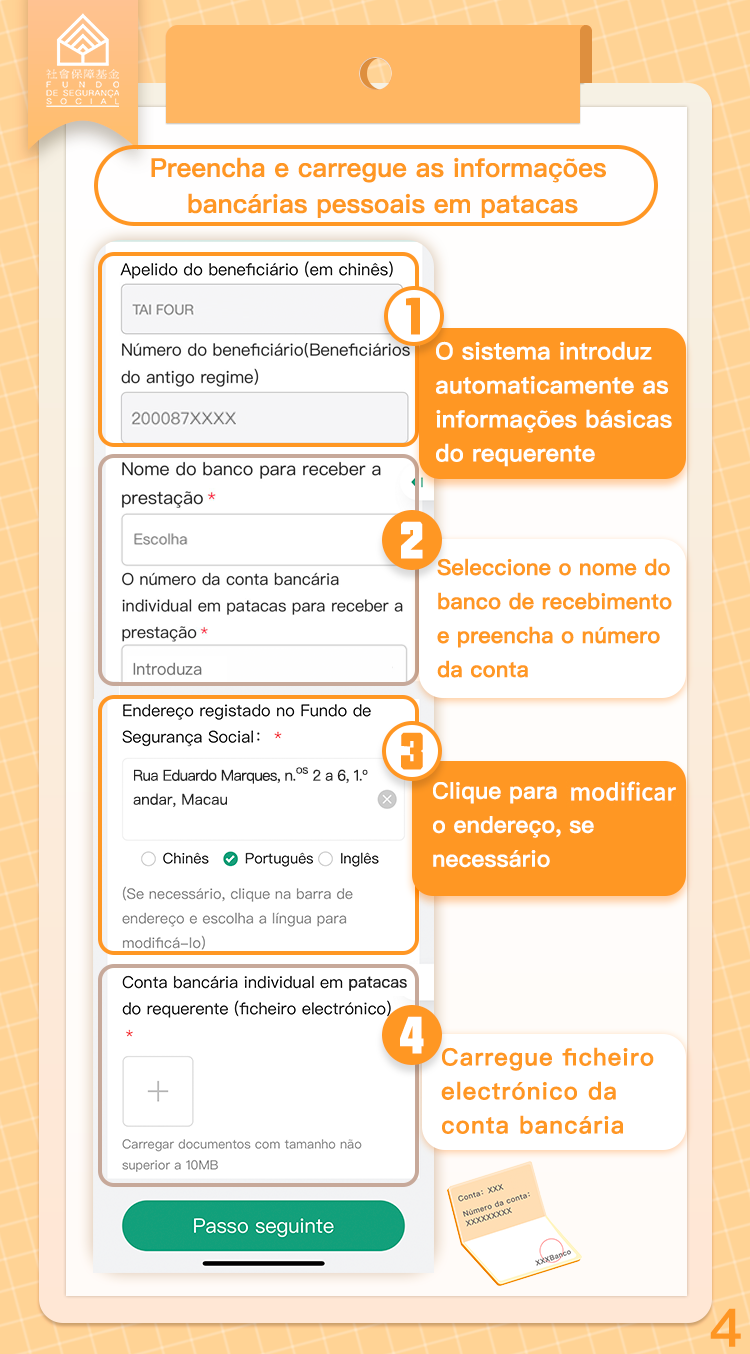 Depois de entrar na interface da “Conta Única de Macau” sobre o pedido da pensão para idosos, o sistema vai indicar, conforme as condições reais do requerente, as informações básicas tais como o montante da pensão para idosos a receber, o número de meses de contribuições acumulados, a eventual percentagem da antecipação da pensão para idosos correspondente à idade, etc. Depois de confirmar e entrar na interface sobre as informações do pedido, o sistema vai mostrar automaticamente os dados básicos tais como o nome de requerente e o número de beneficiário, sendo que o requerente apenas selecciona o banco de recebimento e preenche o número da conta bancária individual em patacas, e caso necessário, o requerente ainda pode mudar o endereço registado no FSS. Após o carregamento de fotografia em que se indicam os dados bancários, incluindo o nome do banco, o nome do titular, o número da conta bancária e a moeda, a confirmação dos dados do pedido e a conclusão do reconhecimento facial conforme as instruções, será terminada com sucesso a apresentação do pedido, sendo muito simples as etapas de operação. A operação na versão web é a mesma, mas é necessário utilizar um dispositivo móvel equiparado com a função de reconhecimento facial, como por exemplo, as etapas de reconhecimento facial precisam do auxílio de telemóvel. Após a submissão do pedido, pode consultar o andamento na “Conta Única de Macau” a qualquer tempo.