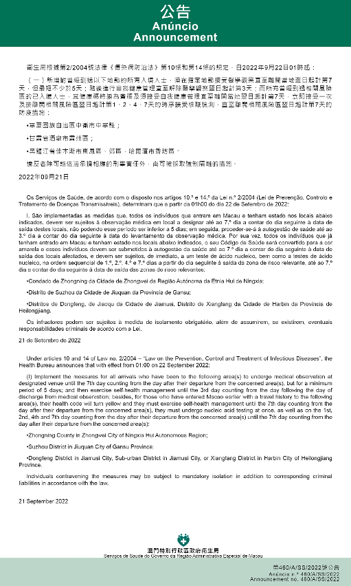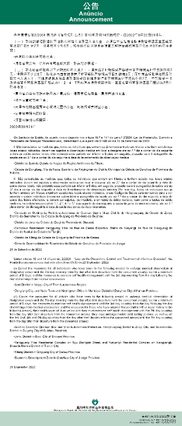 Tendo em consideração a evolução epidemiológica mais actualizada no Interior da China, os Serviços de Saúde, de acordo com o disposto nos artigos 10.º e 14.º da Lei n.º 2/2004 (Lei de Prevenção, Controlo e Tratamento de Doenças Transmissíveis), determinam que a partir da 01h00 do dia 22 de Setembro de 2022, são implementadas ou canceladas as medidas antiepidémicas para quem tenha estado em diversas áreas do Interior da China: