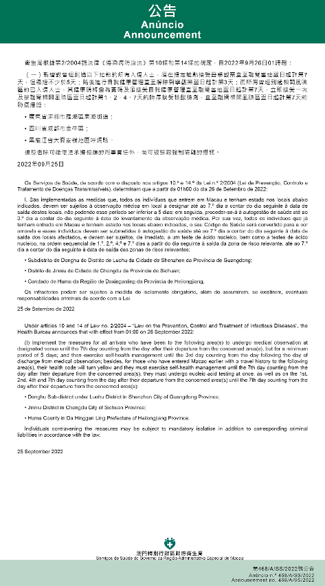 Tendo em consideração a evolução epidemiológica mais actualizada no Interior da China, os Serviços de Saúde, de acordo com o disposto nos artigos 10.º e 14.º da Lei n.º 2/2004 (Lei de Prevenção, Controlo e Tratamento de Doenças Transmissíveis), determinam que a partir da 01h00 do dia 26 de Setembro de 2022, são implementadas ou canceladas as medidas antiepidémicas para quem tenha estado em diversas áreas do Interior da China: