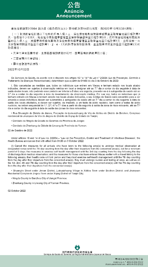 Tendo em consideração a evolução epidemiológica mais actualizada no Interior da China, os Serviços de Saúde, de acordo com o disposto nos artigos 10.º e 14.º da Lei n.º 2/2004 (Lei de Prevenção, Controlo e Tratamento de Doenças Transmissíveis), determinam que a partir da 01h00 do dia 3 de Outubro de 2022, são implementadas ou canceladas as medidas antiepidémicas para quem tenha estado em diversas áreas do Interior da China: