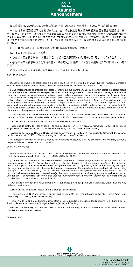 Tendo em consideração a evolução epidemiológica mais actualizada no Interior da China, os Serviços de Saúde, de acordo com o disposto nos artigos 10.º e 14.º da Lei n.º 2/2004 (Lei de Prevenção, Controlo e Tratamento de Doenças Transmissíveis), determinam que a partir das 13h00 do dia 8 de Outubro de 2022, são implementadas as medidas antiepidémicas para quem tenha estado em diversas áreas do Interior da China: