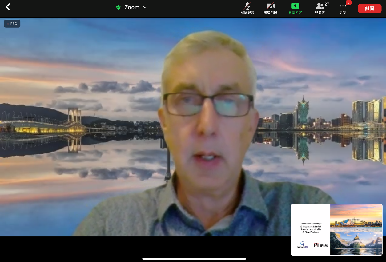 Para a indústria local conhecer melhor o desenvolvimento do mercado internacional de convenções e exposições, esta sessão de formação online convidou o especialista australiano Mike Williams, sócio sénior da GainingEdge e consultor da área de convenções e exposições do IPIM, e a especialista singapurense Esther Ng, directora de desenvolvimento do mercado do Sudeste Asiático da GainingEdge, para falarem sobre a realidade do mercado de convenções e exposições nos países do Sudeste Asiático, na Austrália e na Nova Zelândia, bem como sobre as oportunidades e os desafios para Macau no mercado de convenções e exposições da Ásia-Pacífico.