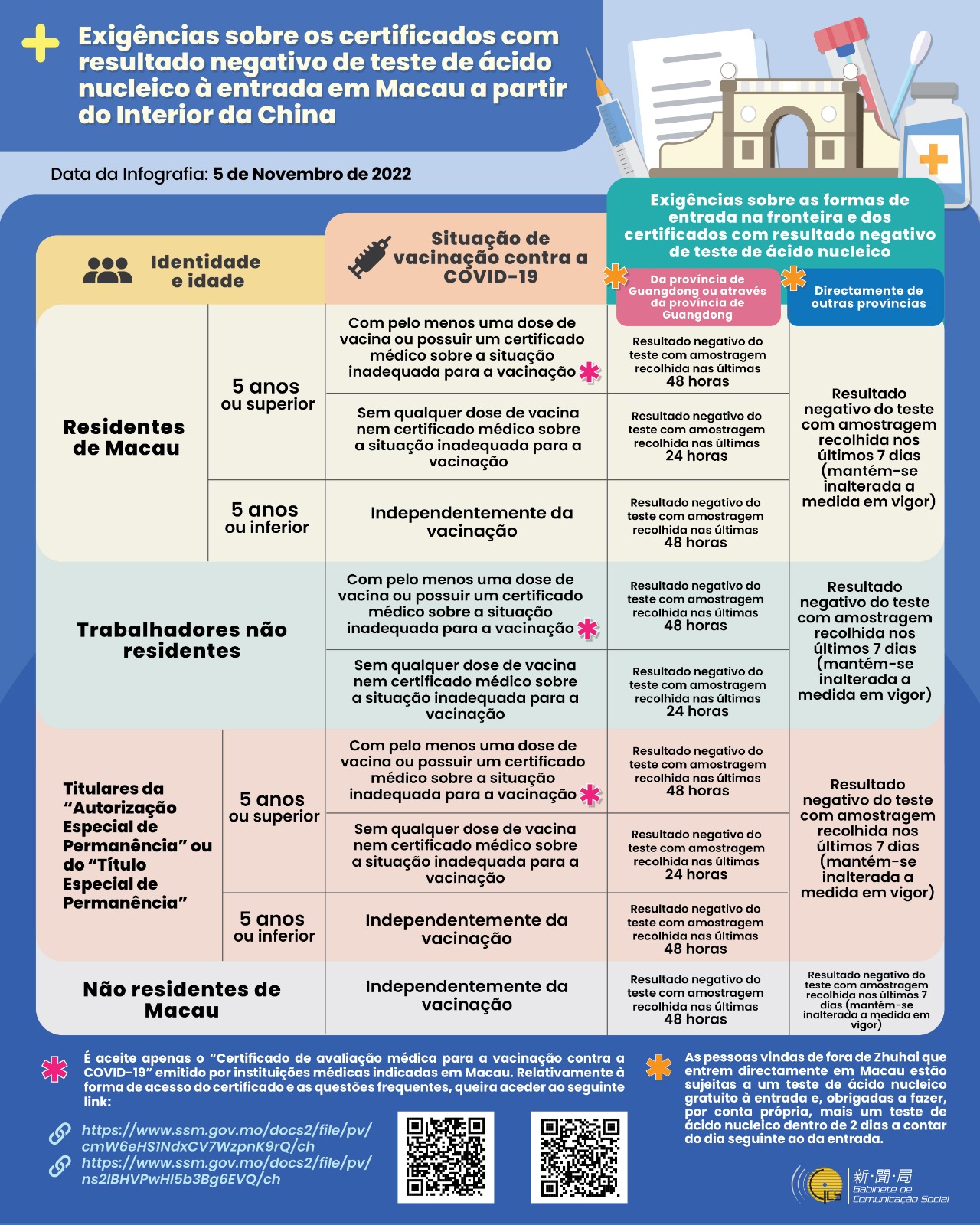 (Infografia) Exigências sobre os certificados com resultado negativo de teste de ácido nucleico à entrada em Macau a partir do Interior da China