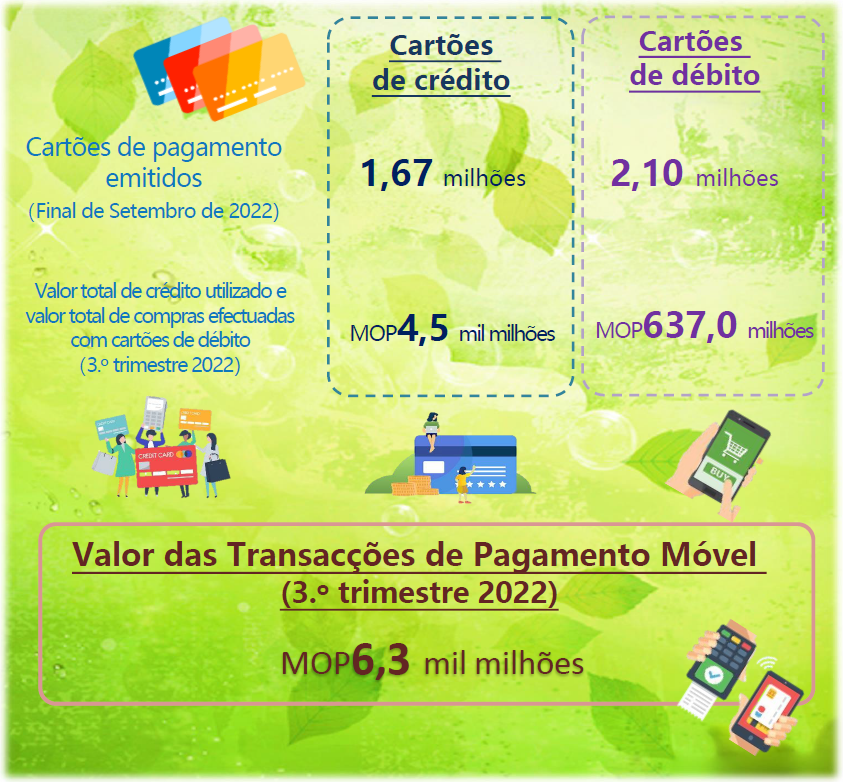 No terceiro trimestre de 2022, o número de transacções foi de 61,4 milhões, o que representou um créscimo de 13,8% relativamente ao ano anterior, enquanto que o valor das transacções foi de MOP6,3 mil milhões, correspondendo a um créscimo de 18,6% relativamente ao ano anterior. O valor médio por transacção foi de MOP102,4. Até ao final de Setembro de 2022, o número de aparelhos que aceitam o pagamento móvel e os suportes de “QR Code” em Macau atingiu 92,9 mil, tendo traduzido a um crescimento de 10,5% relativamente ao ano anterior.
