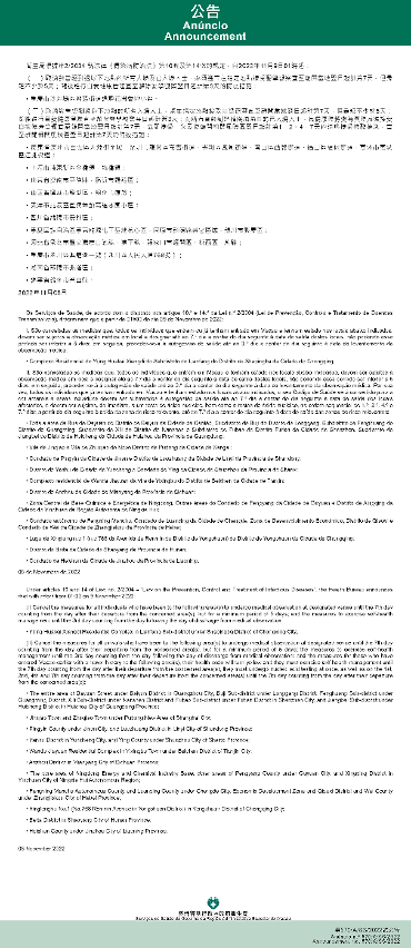 Tendo em consideração a evolução epidemiológica mais actualizada no Interior da China, os Serviços de Saúde, de acordo com o disposto nos artigos 10.º e 14.º da Lei n.º 2/2004 (Lei de Prevenção, Controlo e Tratamento de Doenças Transmissíveis), determinam que a partir da 01h00 do dia 09 de Novembro de 2022, são implementadas ou canceladas as medidas antiepidémicas para quem tenha estado em diversas áreas do Interior da China: