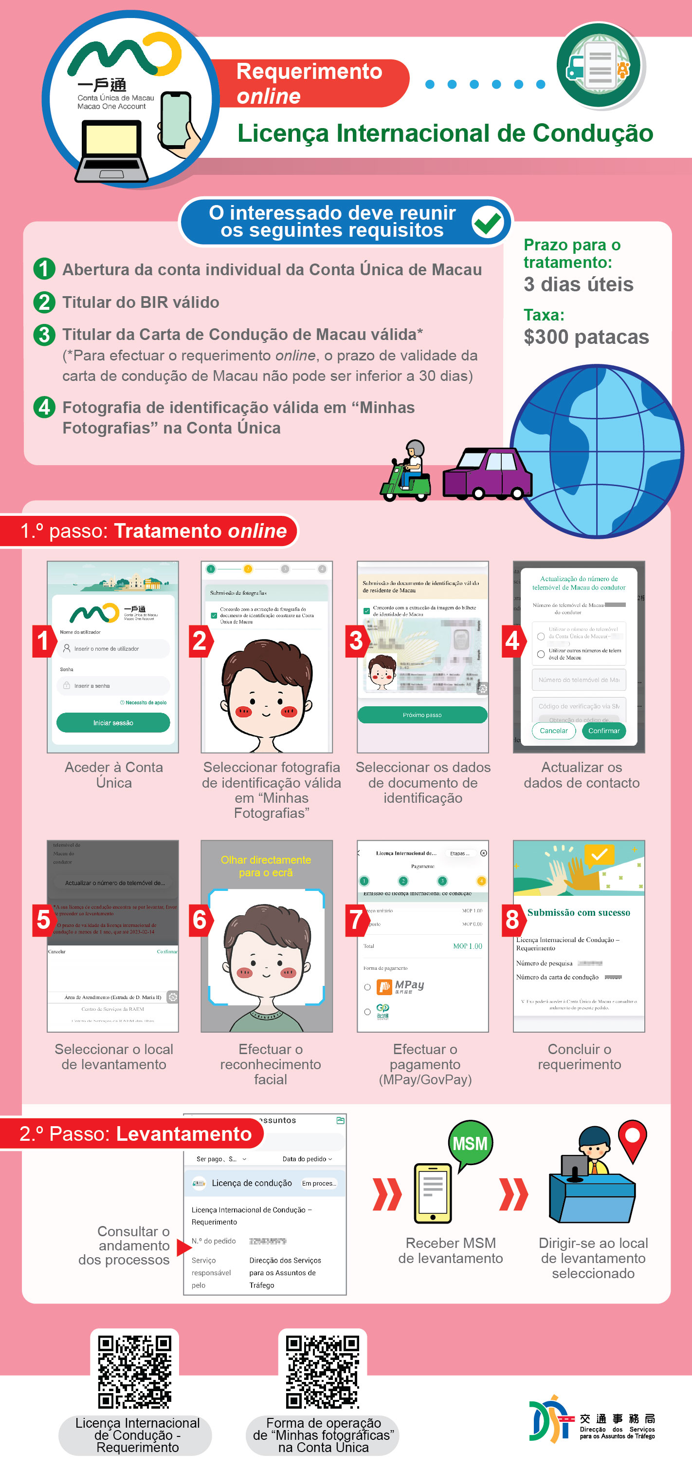 Em relação ao requerimento on-line da licença internacional de condução, o interessado deve ter em conta que que o prazo de validade da sua carta de condução de Macau não pode ser inferior a 30 dias, podendo o requerimento ser feito on-line. No tratamento do requerimento, os interessados devem apresentar a fotografia de identificação em “Minhas Fotografias”, efectuar o pagamento on-line e realizar o reconhecimento facial para concluir o respectivo requerimento.