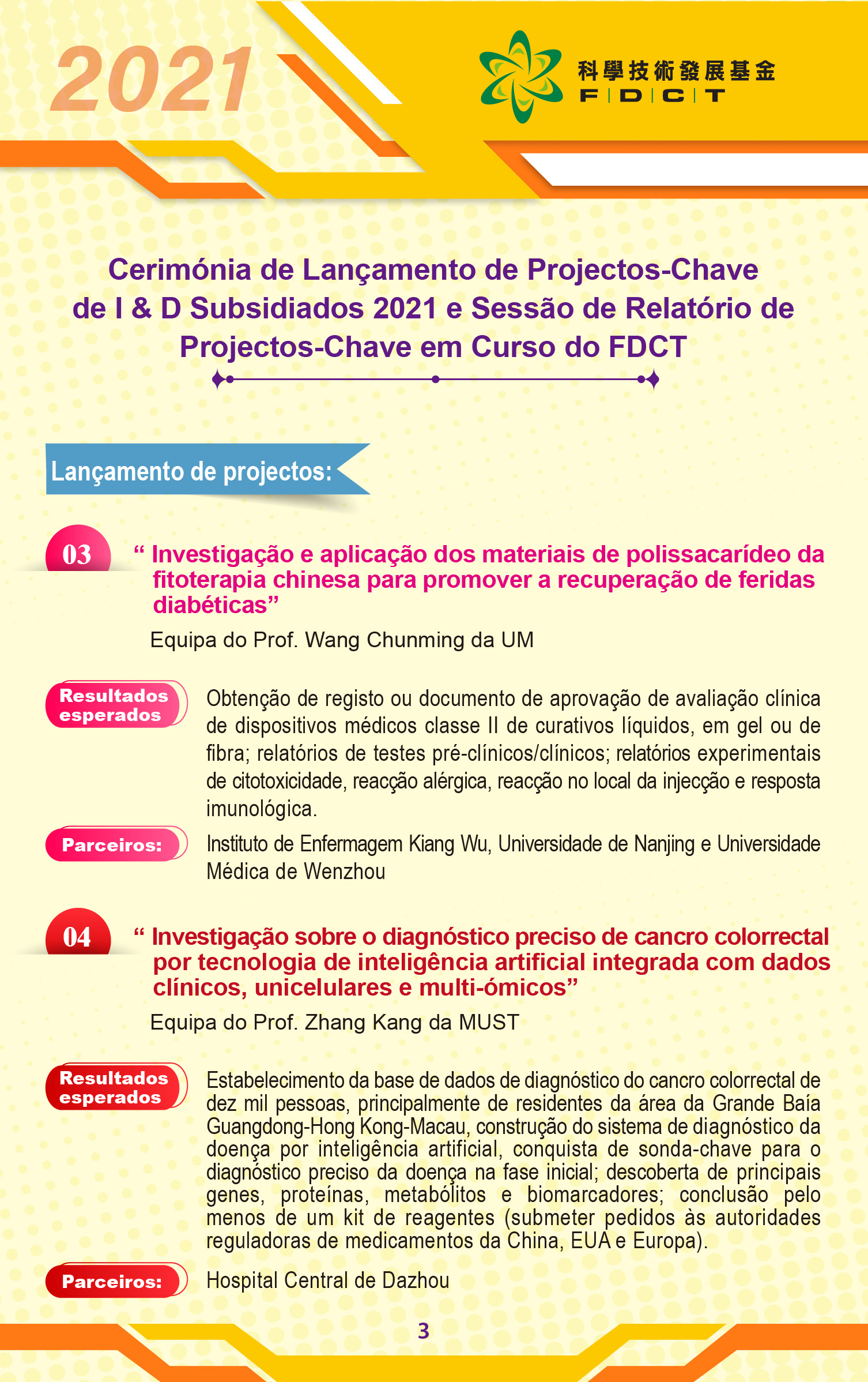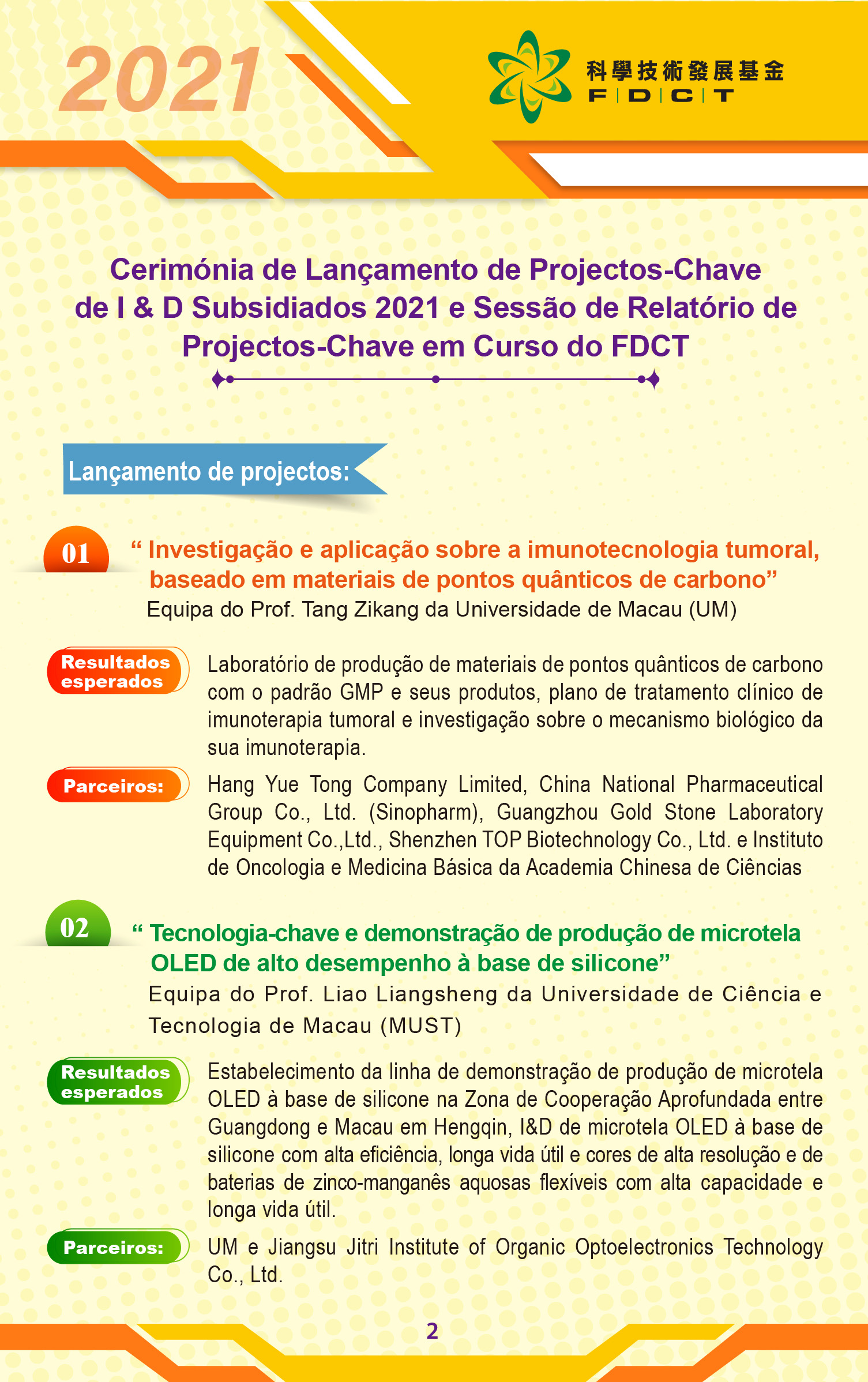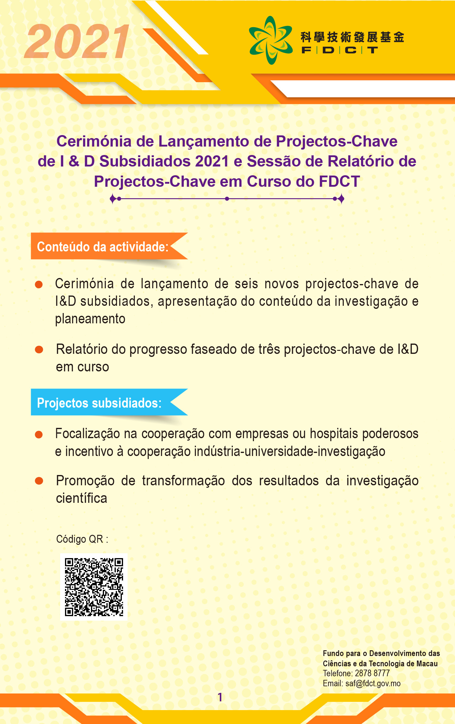 Devido ao impacto da epidemia, o evento foi realizado online e presencialmente simultaneamente para assegurar que o público tivesse acesso à informação relevante, respeitando rigorosamente as medidas de prevenção da epidemia e controlando o número de participantes conforme as directrizes. As equipas dos projectos também responderam a perguntas dos participantes, para que tivessem um melhor conhecimento sobre a execução dos projectos subsidiados e o progresso das investigações faseadas. A informação relacionada aos projectos apresentados está disponível no website do FDCT ( https://www.fdct.gov.mo ). Para quaisquer dúvidas, é favor contactar através do número de telefone 28788777 ou enviar e-mail para saf@fdct.gov.mo.