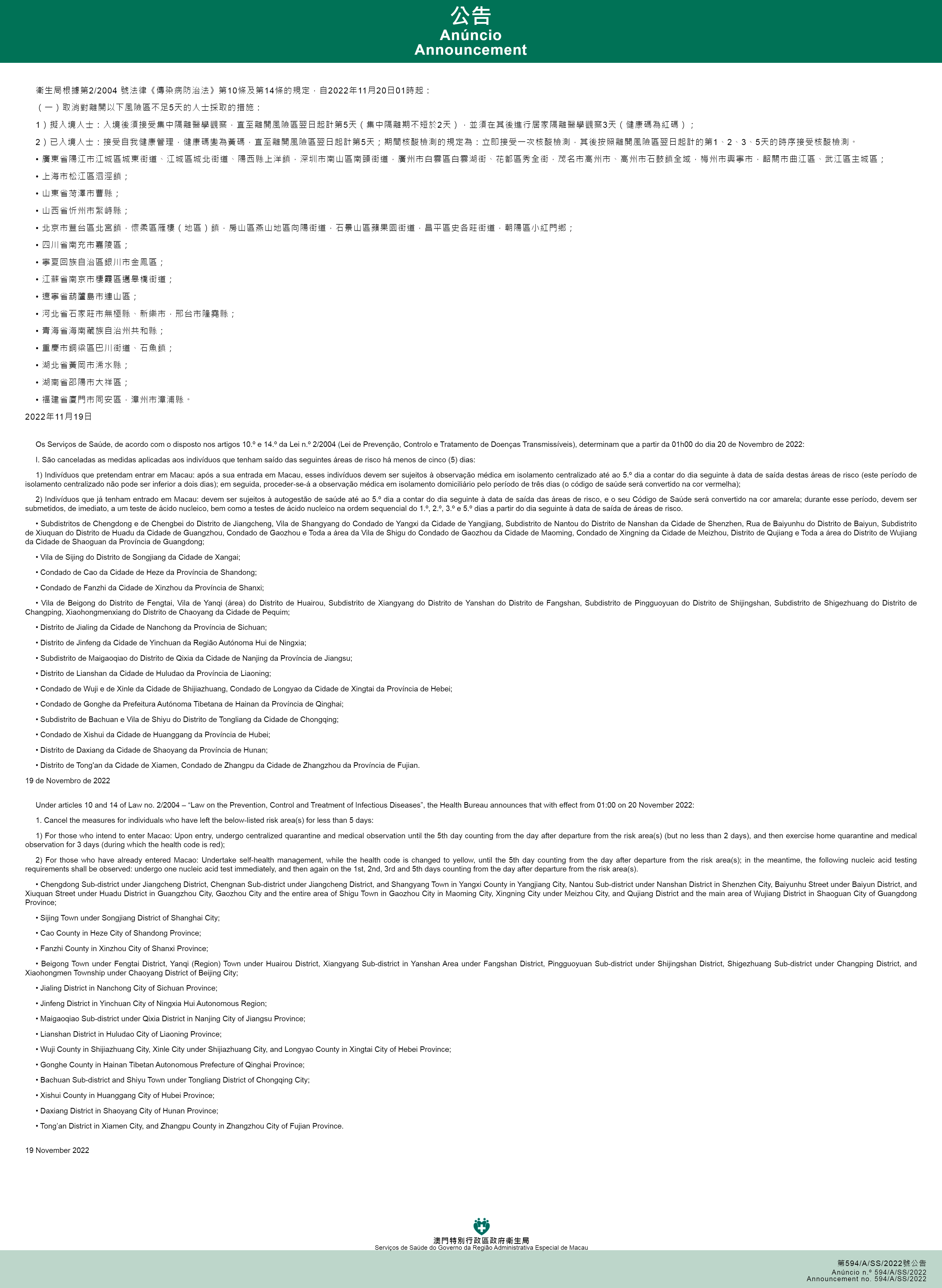 Tendo em consideração a evolução epidemiológica mais actualizada no Interior da China, os Serviços de Saúde, de acordo com o disposto nos artigos 10.º e 14.º da Lei n.º 2/2004 (Lei de Prevenção, Controlo e Tratamento de Doenças Transmissíveis), determinam que a partir da 01h00 do dia 20 de Novembro de 2022, são implementadas ou canceladas as medidas antiepidémicas para quem tenha estado em diversas áreas do Interior da China: