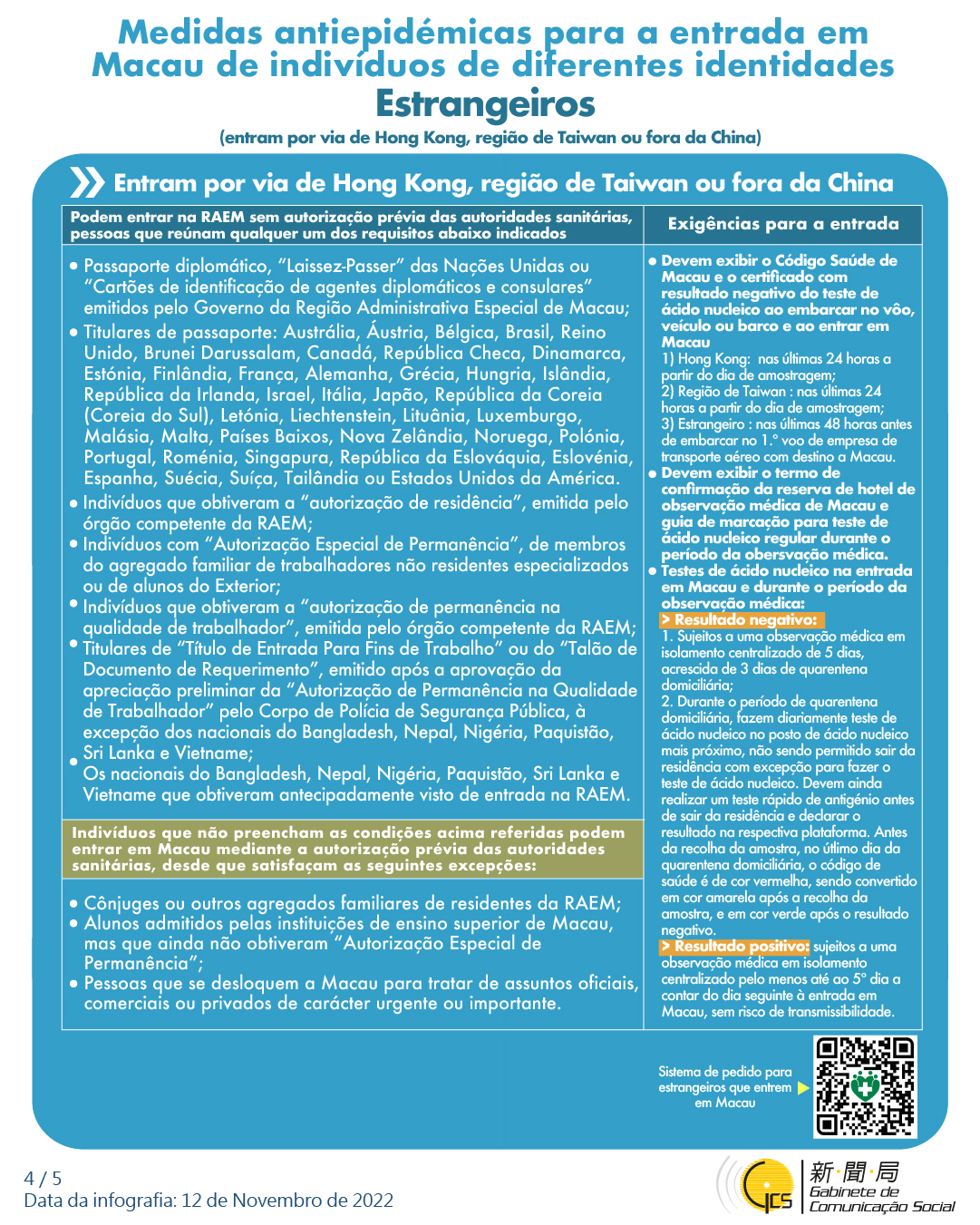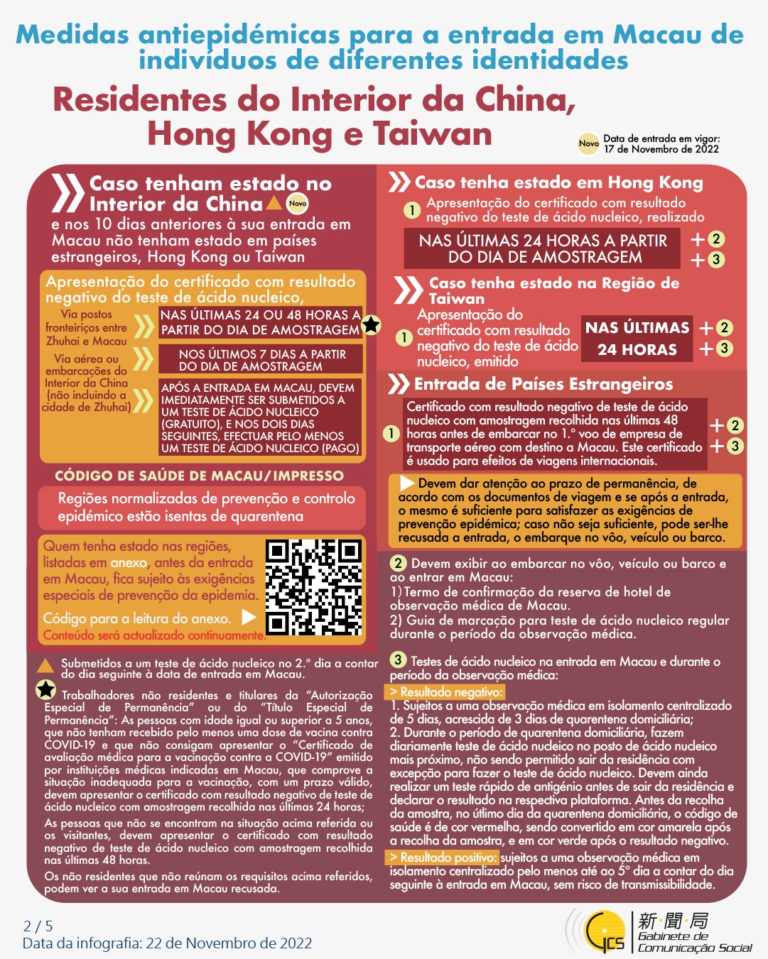 (Infografia) Medidas antiepidémicas para a entrada em Macau de indivíduos de diferentes identidades, actualizadas no dia 22 de Novembro de 2022.