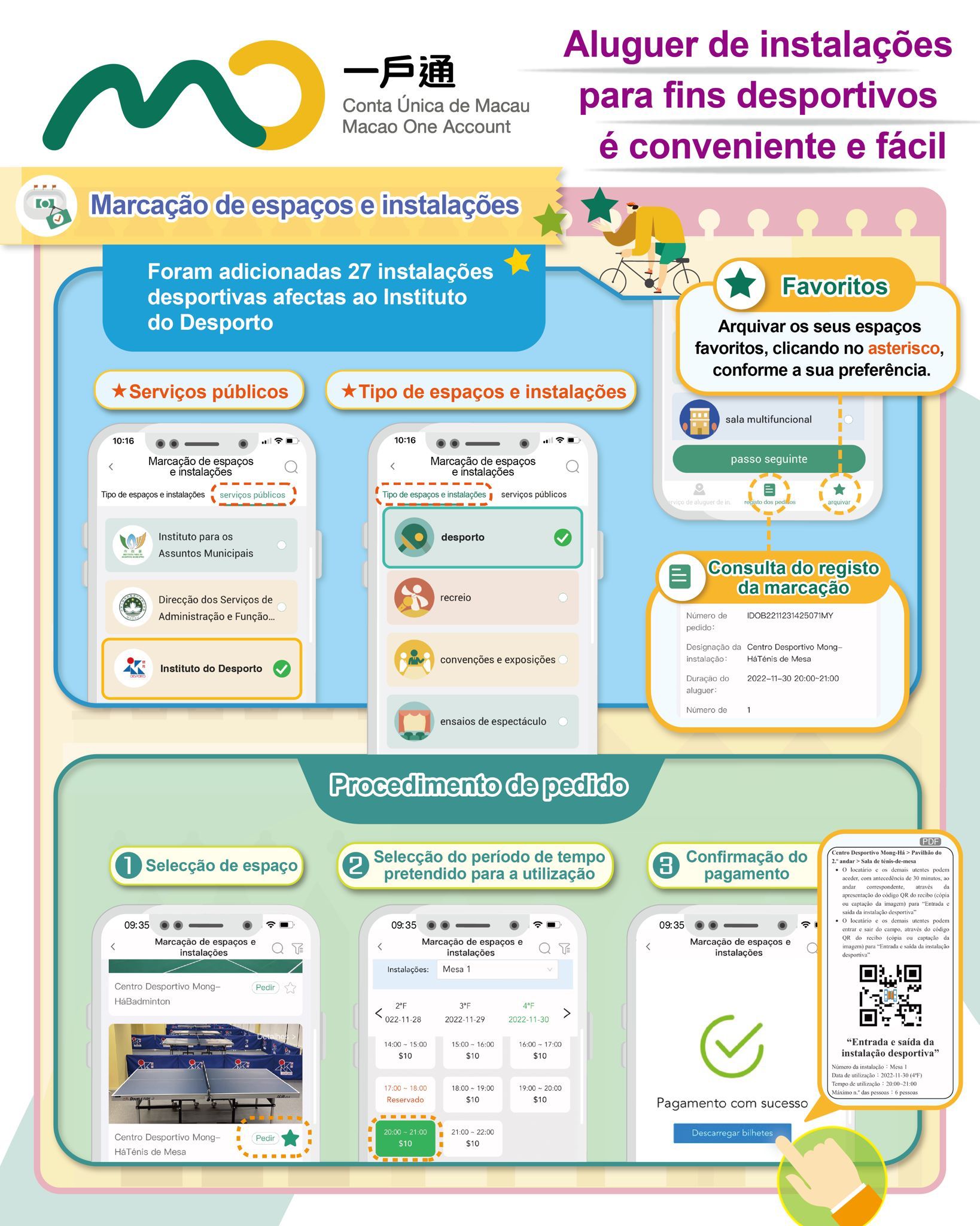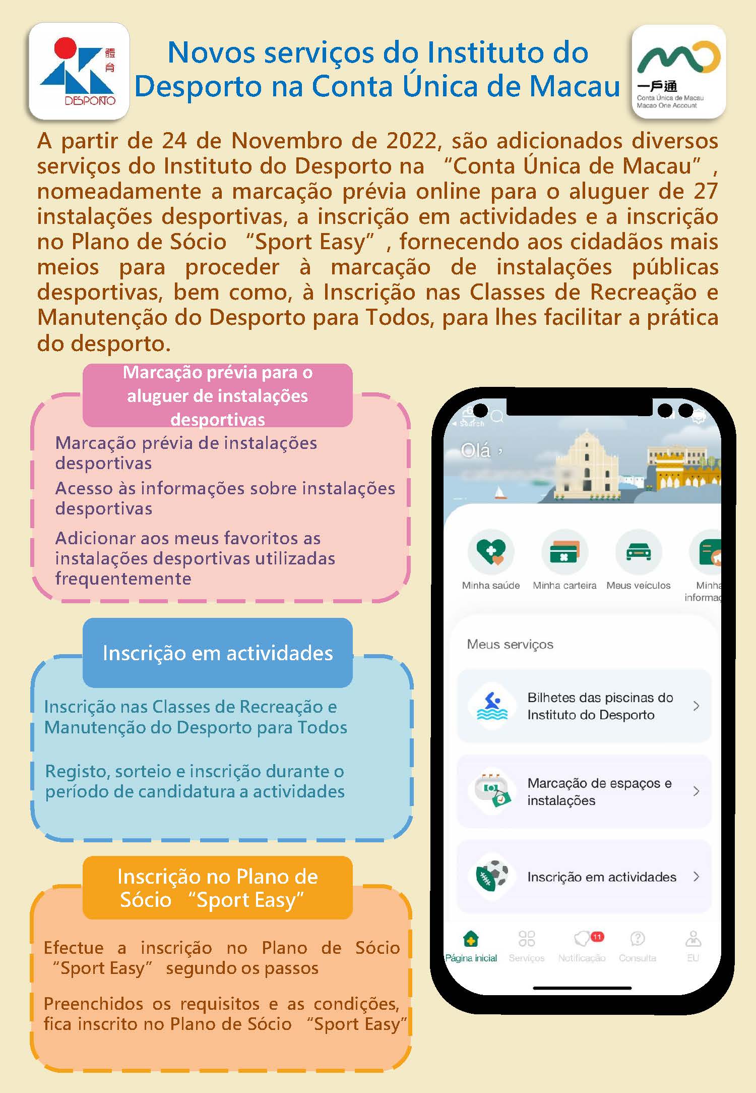 Em articulação com o desenvolvimento da governação electrónica da RAEM, a partir de 24 de Novembro de 2022, são adicionadas diversas funcionalidades do Instituto do Desporto (ID) na Conta Única de Macau, nomeadamente a marcação prévia online para o aluguer de instalações desportivas, a inscrição em actividades e a inscrição no Plano de Sócio “Sport Easy”, fornecendo aos cidadãos mais meios para proceder à marcação de instalações públicas desportivas, bem como, à inscrição online nas classes de recreação e manutenção do Desporto para Todos, para facilitar a prática do desporto, juntamente com a “marcação online para adquirir as senhas de acesso às piscinas afectas ao ID” e o “serviço online de compra das senhas de acesso às piscinas da sessão do tempo real” ambos adicionados anteriormente na Conta Única de Macau.