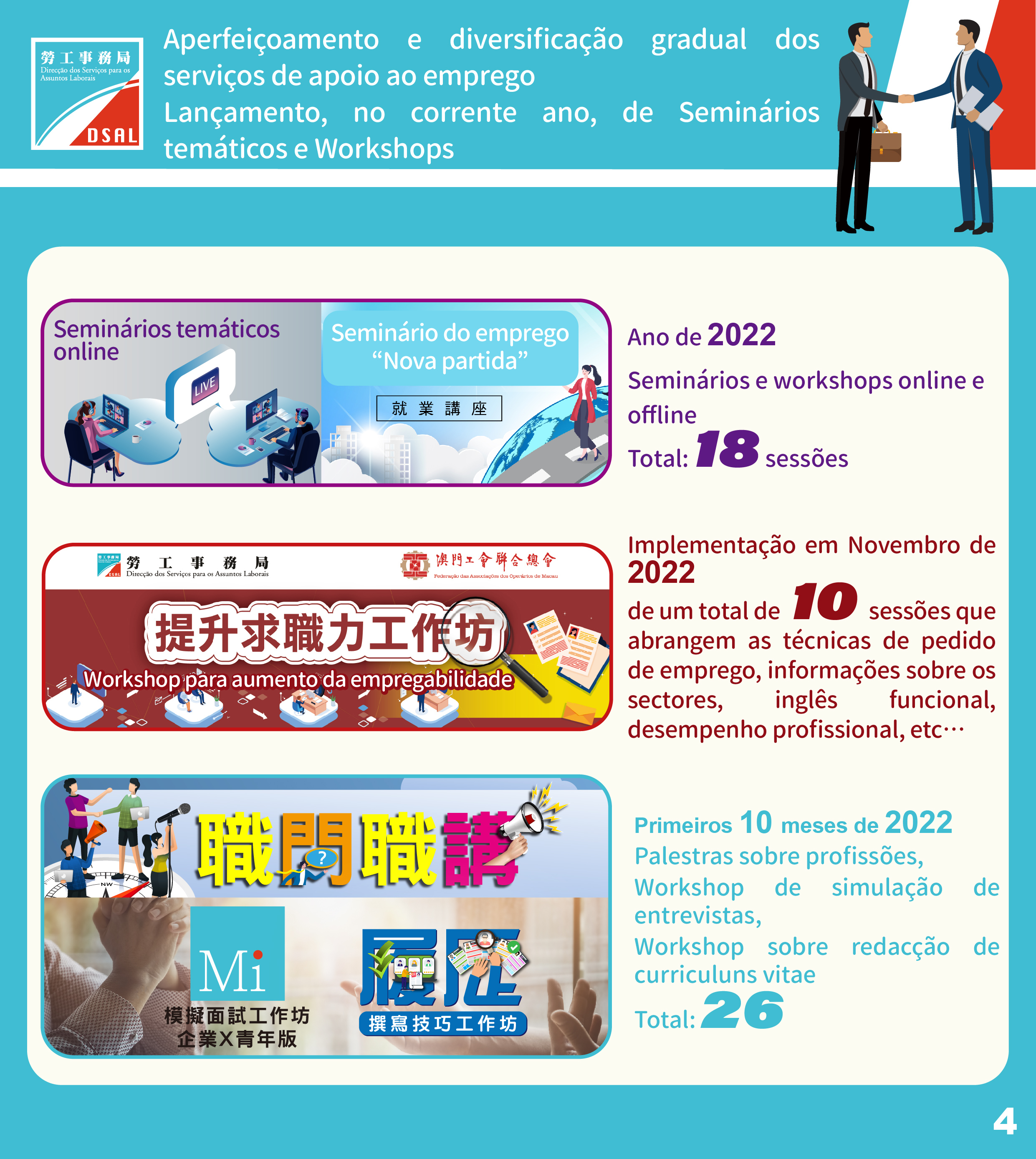 Em Novembro do corrente ano, a DSAL vai colaborar com a Federação das Associações dos Operários de Macau na organização de um total de 10 “Workshops sobre aumento da capacidade de candidatura a emprego” cujos conteúdos incidirão sobre técnicas de candidatura, informações dos sectores, inglês profissional, profissionalismo, entre outros, para ajudar os candidatos a ficarem bem preparados para a candidatura.