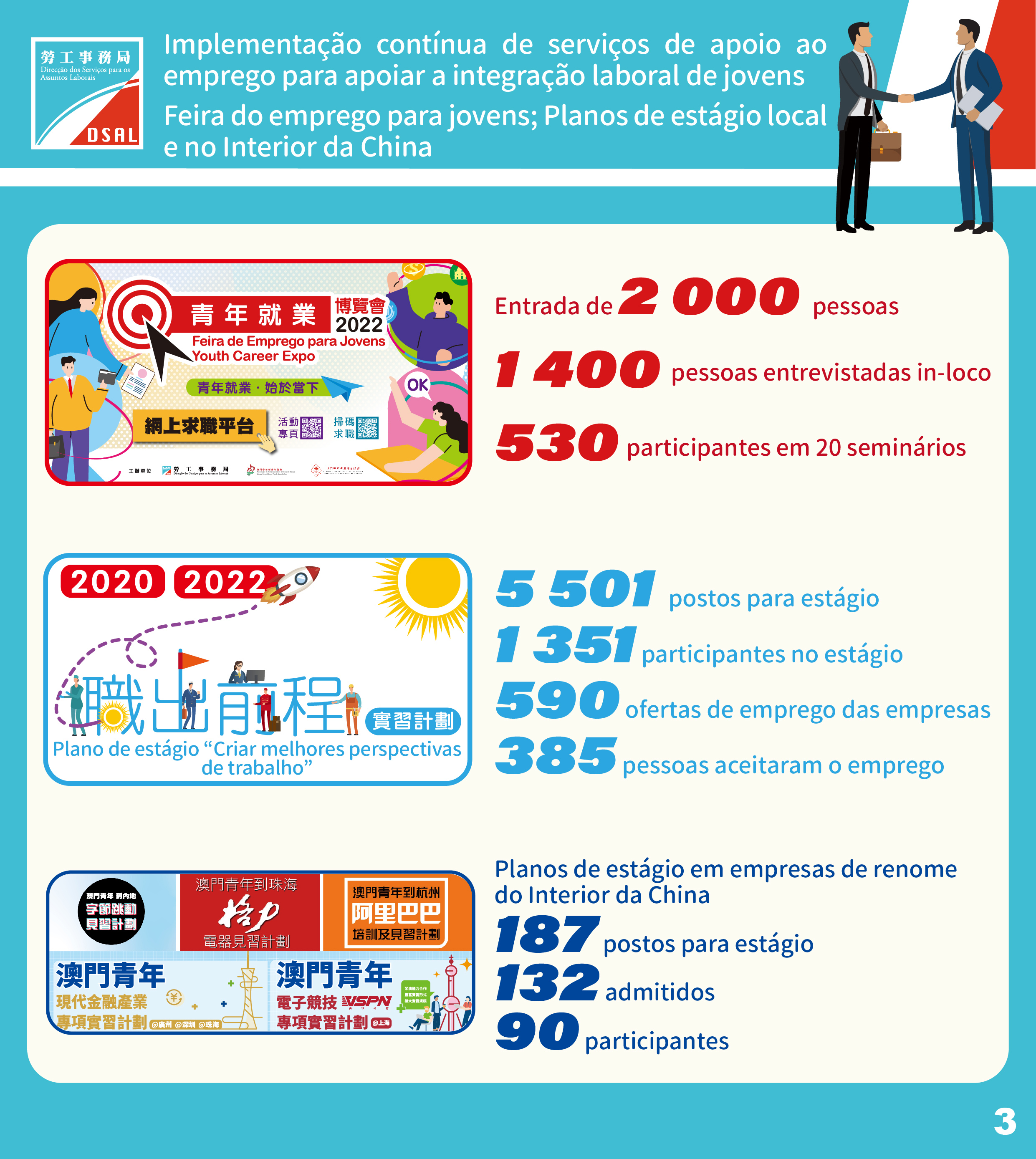 Por outro lado, em consonância com o desenvolvimento das novas indústrias de Macau, a partir de 2021, a DSAL cooperou com várias empresas de renome do Interior da China no lançamento do plano de estágio destinado aos jovens de Macau para alargar os horizontes dos jovens e desenvolver a sua carreira profissional. Até ao presente, foram lançados cinco planos de estágios no Interior da China.