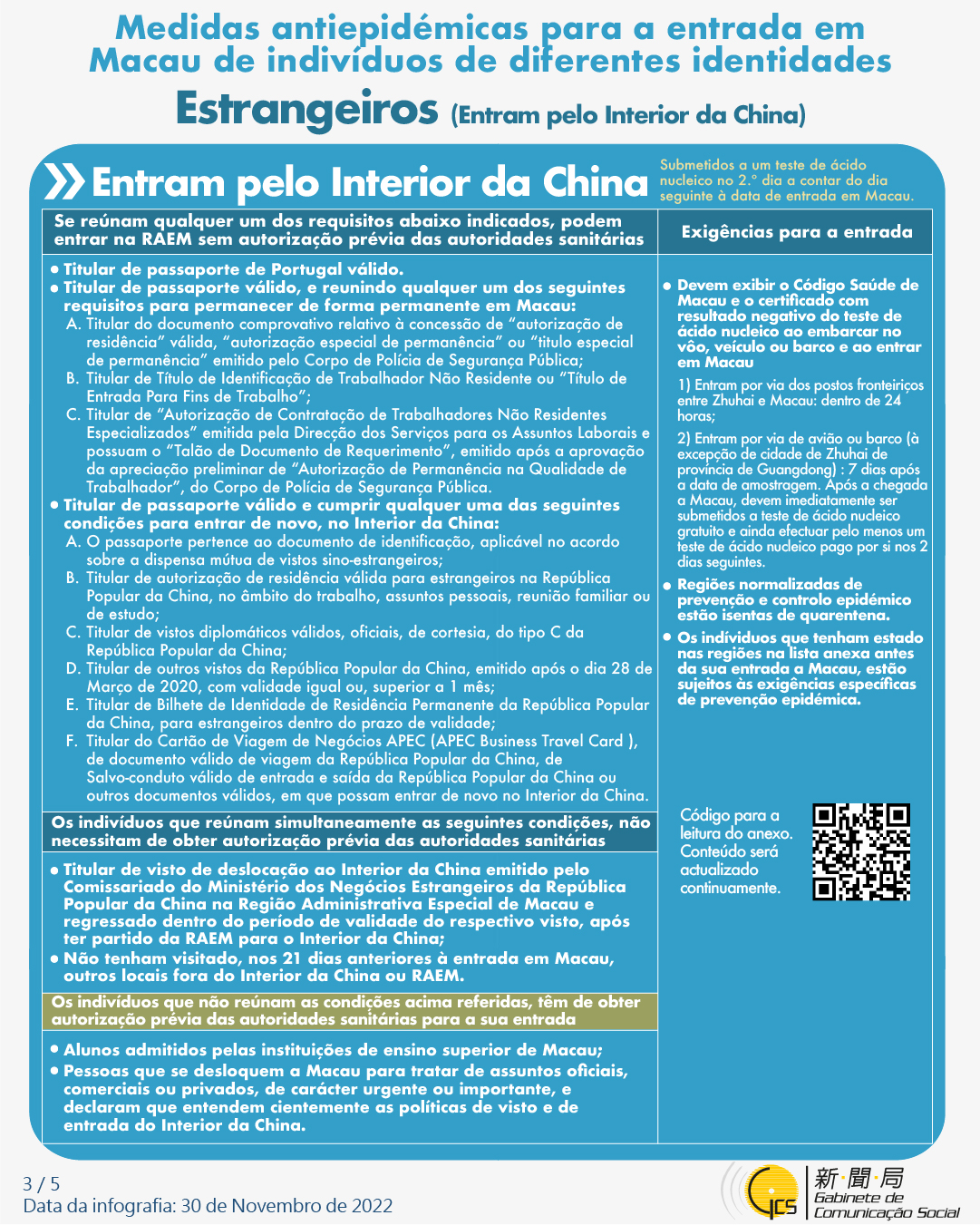 (Infografia) Medidas antiepidémicas para a entrada em Macau de indivíduos de diferentes identidades, actualizadas no dia 30 de Novembro de 2022.