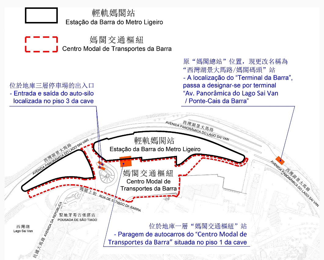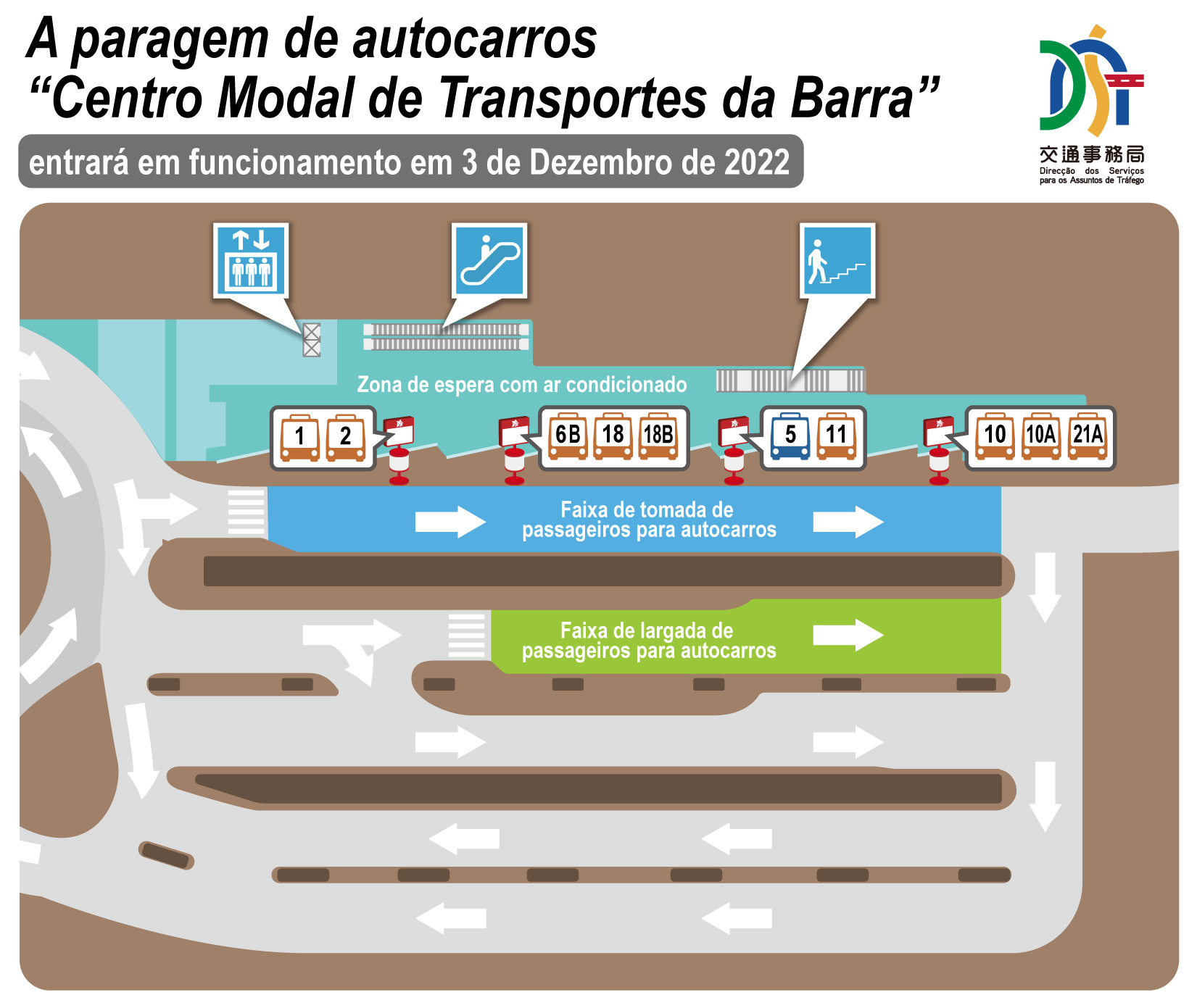 Para o referido arranjo, a partir do dia 3 de Dezembro, o terminal de partida dos autocarros n.ºs 1, 2, 5, 6B, 10, 10A, 11, 18, 18B e 21A será ajustado para a paragem de autocarros do Centro Modal de Transportes da Barra, que dispõe dos vários pontos de tomada e largada de passageiros, com capacidade para o estacionamento, em simultâneo, de cerca de 23 autocarros. Por outro lado, será mantido o actual Terminal da Barra, cujo nome será alterado para “Avenida Panorâmica do Lago Sai Van/Ponte-Cais da Barra”, bem como as actuais carreiras de autocarros, contudo, o autocarro n.º 5 deixará de parar na “Torre/Túnel Rodoviário” e na “Torre de Macau”.