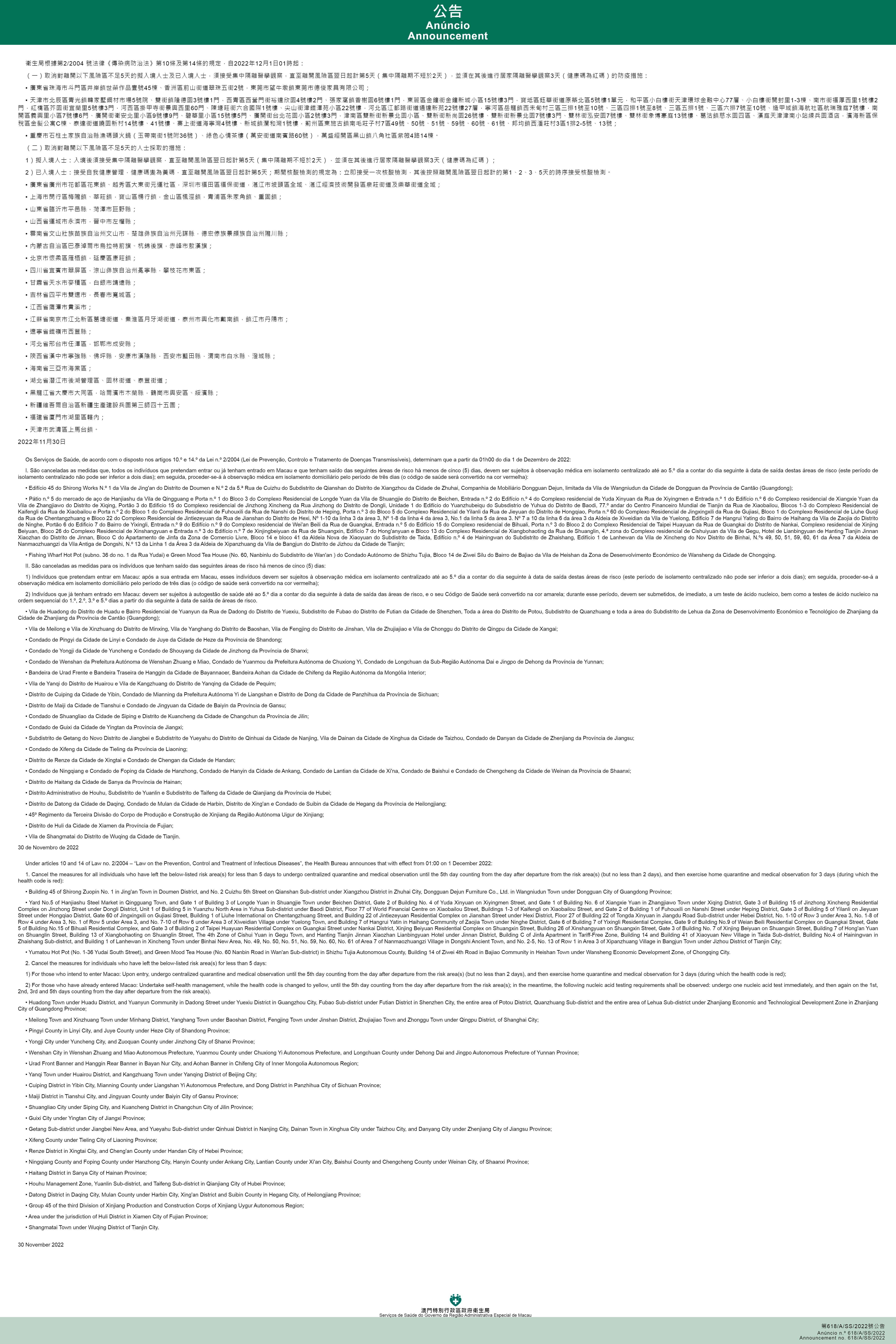 Tendo em consideração a evolução epidemiológica mais actualizada no Interior da China, os Serviços de Saúde, de acordo com o disposto nos artigos 10.º e 14.º da Lei n.º 2/2004 (Lei de Prevenção, Controlo e Tratamento de Doenças Transmissíveis), determinam que a partir da 01h00 do dia 1 de Dezembro de 2022, são implementadas ou canceladas as medidas antiepidémicas para quem tenha estado em diversas áreas do Interior da China: