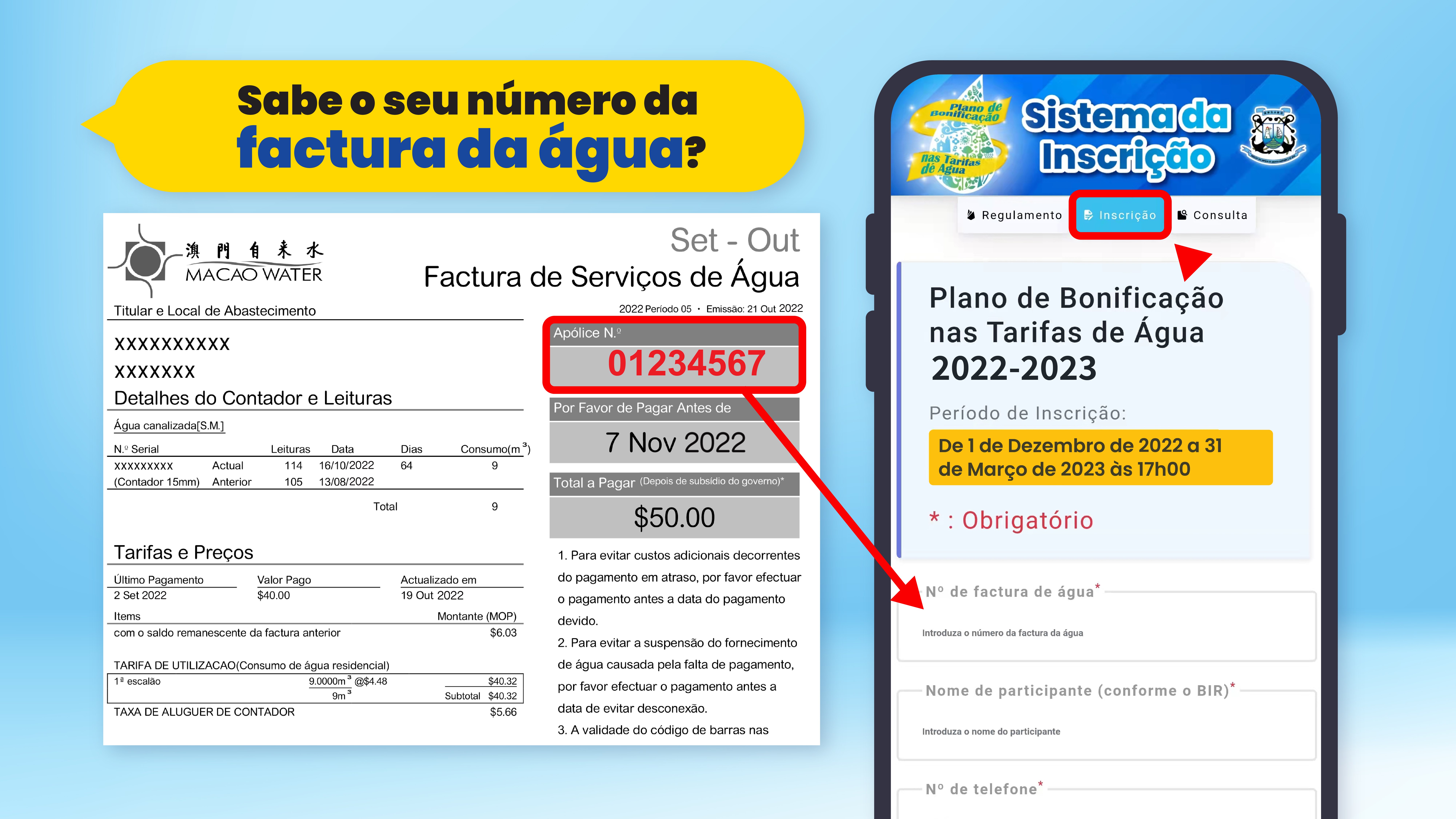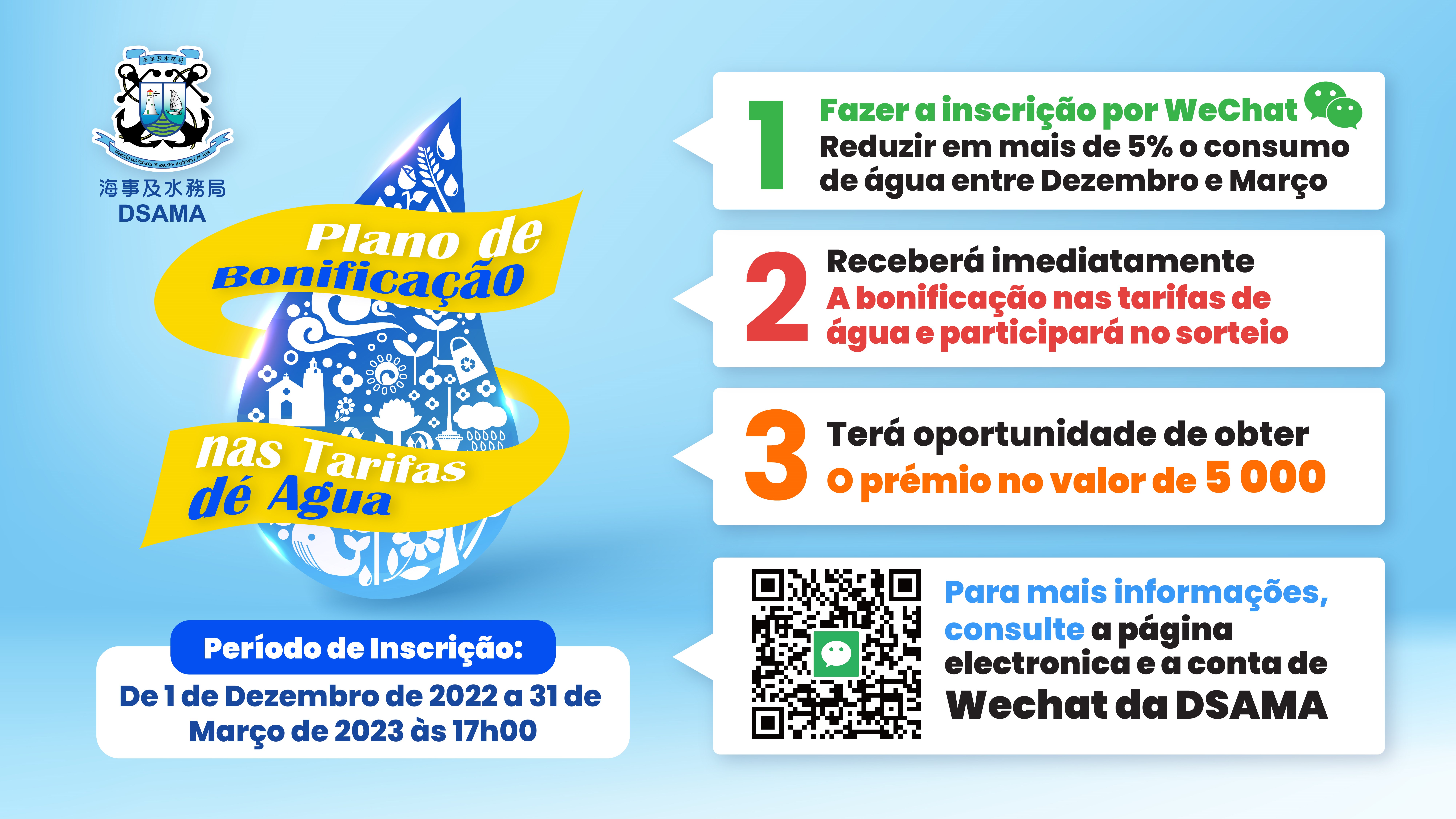 Os primeiros 6 000 inscritos que reduzam de 5% a 30% do consumo de água entre Dezembro de 2022 e Março de 2023 face ao período homólogo, receberão MOP100 nas tarifas de água e habilitar-se-ão a ganhar no sorteio cupões com valor de $5000 cada em compras de supermercado e mais de 300 prémios. As inscrições terminarão até 17h00 do 31 de Março de 2023.