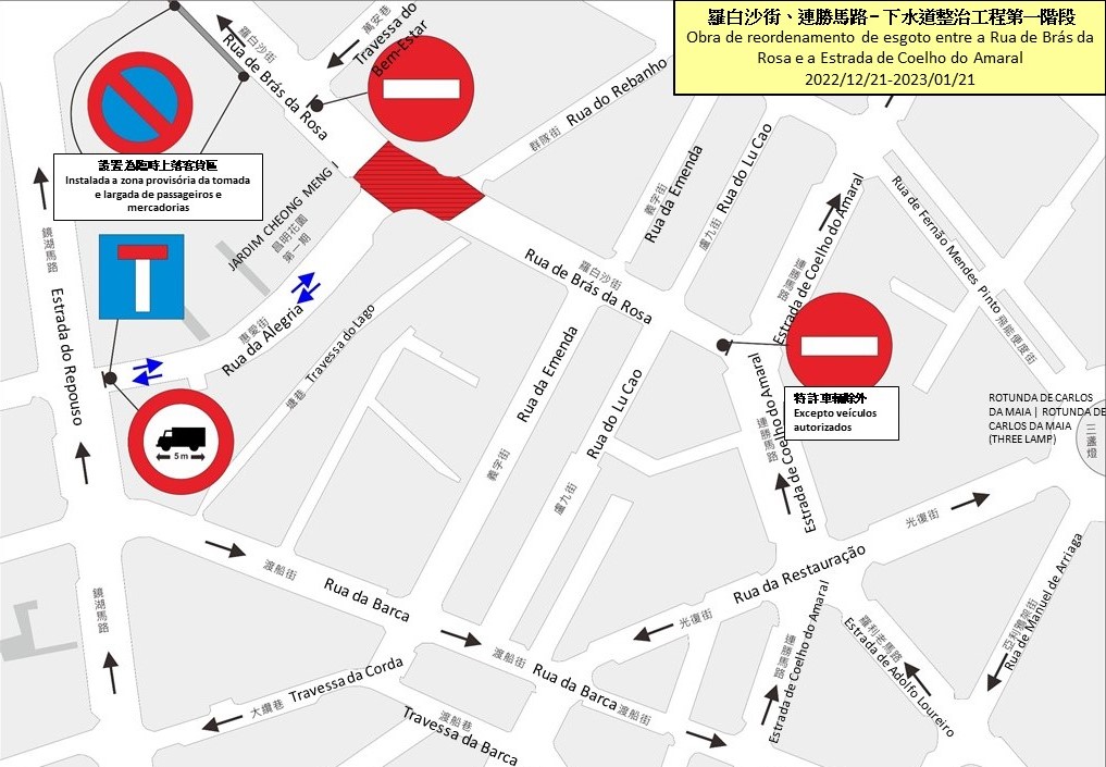 Para articular com as necessidades da obra, serão aplicadas medidas de condicionamento provisório ao trânsito constantes da tabela em anexo a partir do dia 21 de Dezembro (quarta-feira) em coordenação com a Direcção dos Serviço para os Assuntos de Tráfego (DSAT), entre as quais, serão implementadas medidas de encerramento ao trânsito na Rua de Brás da Rosa. Para manter a circulação do trânsito, embora condicionada, na Estrada de Coelho do Amaral, o contentor de compressão de lixo localizado no encruzamento entre a Rua de Brás da Rosa e a Estrada de Coelho do Amaral será temporariamente relocalizado para outro local adjacente com base no andamento real da obra, por forma a desocupar espaço para a passagem temporária de veículos. No final da obra, o local original será destinado a construir um novo posto de contentor de compressão de lixo. Além disso, tendo em conta a exploração das empresas do bairro e a necessidade dos pais de levar e buscar as crianças à escola, será instalada uma zona de carga e descarga de mercadorias e de passageiros na zona periférica. Na área de execução da obra, serão também tomadas medidas de vedação provisória e mantido, tanto quanto possível, o fluxo dos passeios.