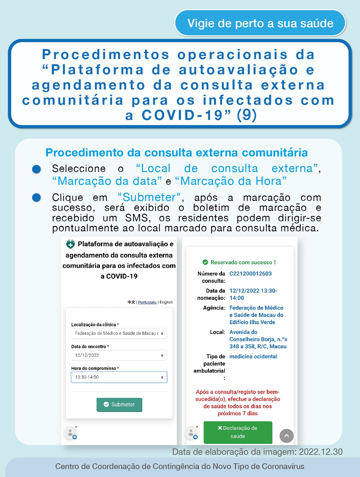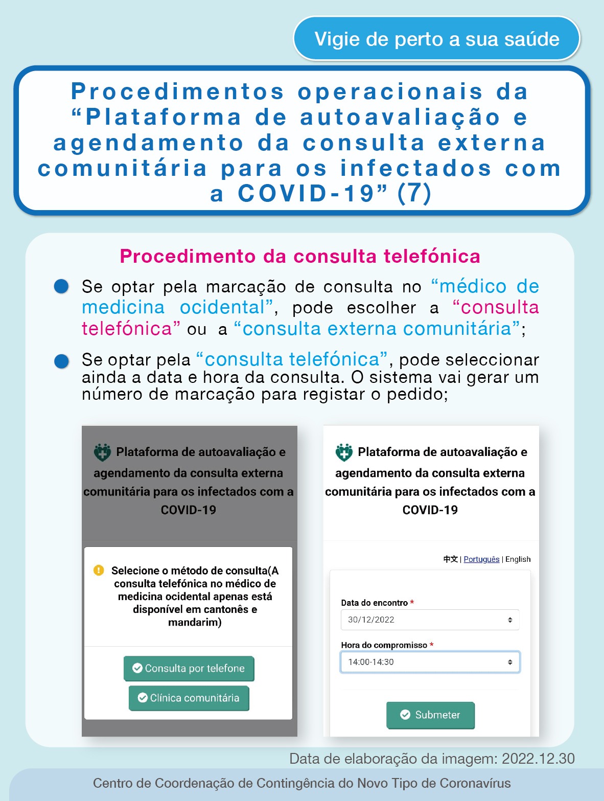 Para facilitar ainda mais aos infectados com sintomas ligeiros e diferentes necessidades de tratamento a realização das consultas médicas, durante o período nocturno, o “Centro de Coordenação” irá optimizar, a partir de amanhã (31 de Dezembro), os serviços de consulta externa comunitária, acrescentando, no âmbito de consulta externa comunitária e na “Plataforma de Auto-avaliação”, os serviços de consulta telefónica de “médico de medicina ocidental”, com o horário de atendimento das 10h00 até às 21h00 e cujo procedimento é o seguinte (Vide o anexo [infografia]):