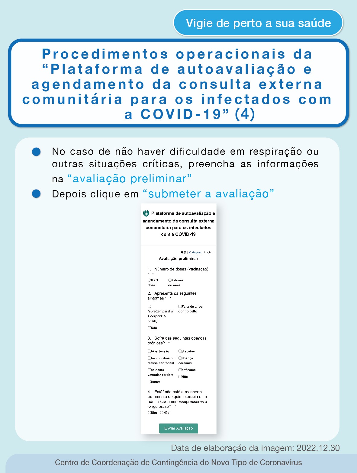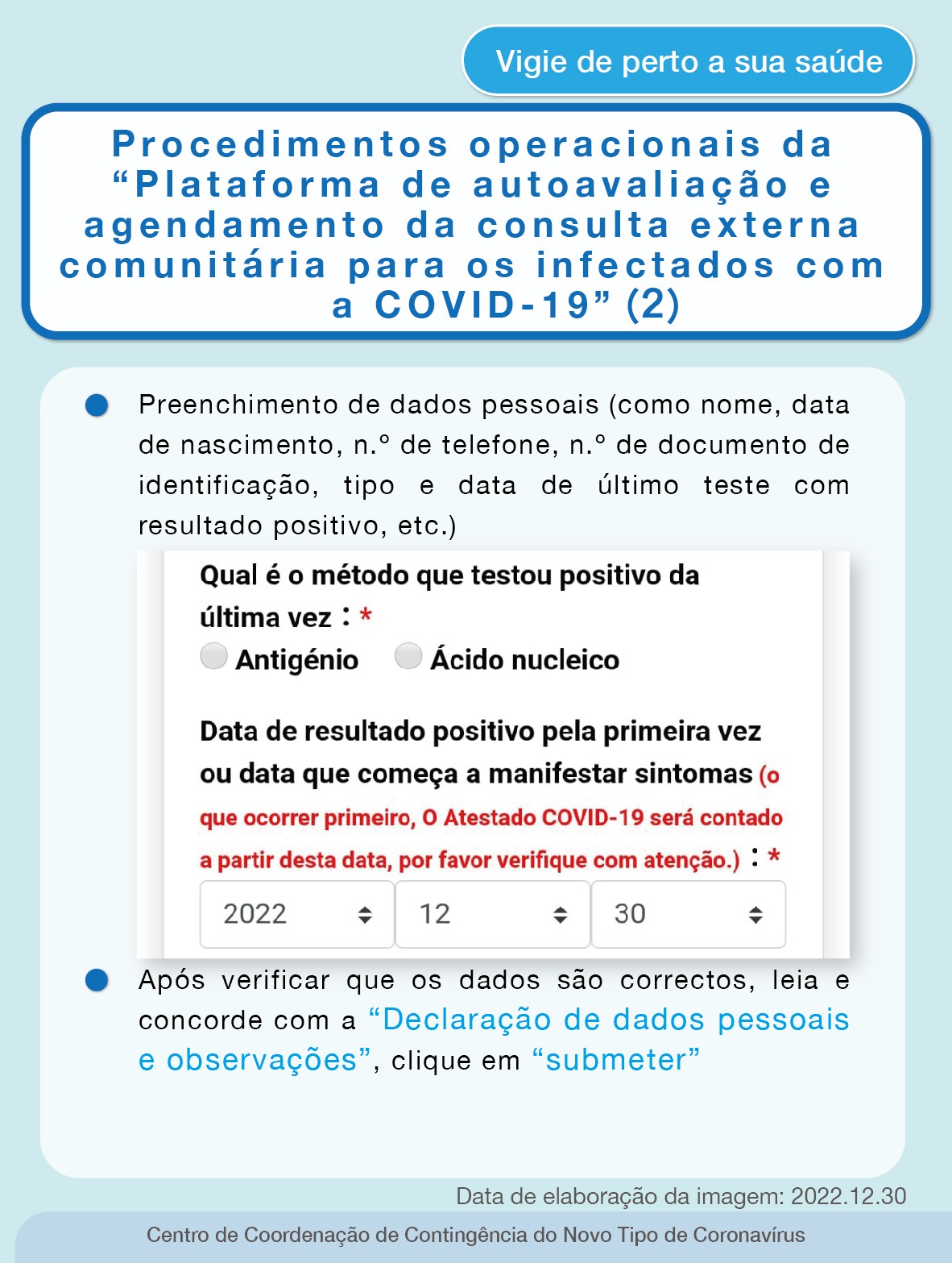 - As pessoas com resultados positivos de teste rápido de antigénio ou teste de ácido nucleico devem proceder à auto-avaliação através da “Plataforma de Auto-avaliação” (https://eservice.ssm.gov.mo/covid19positivebook);