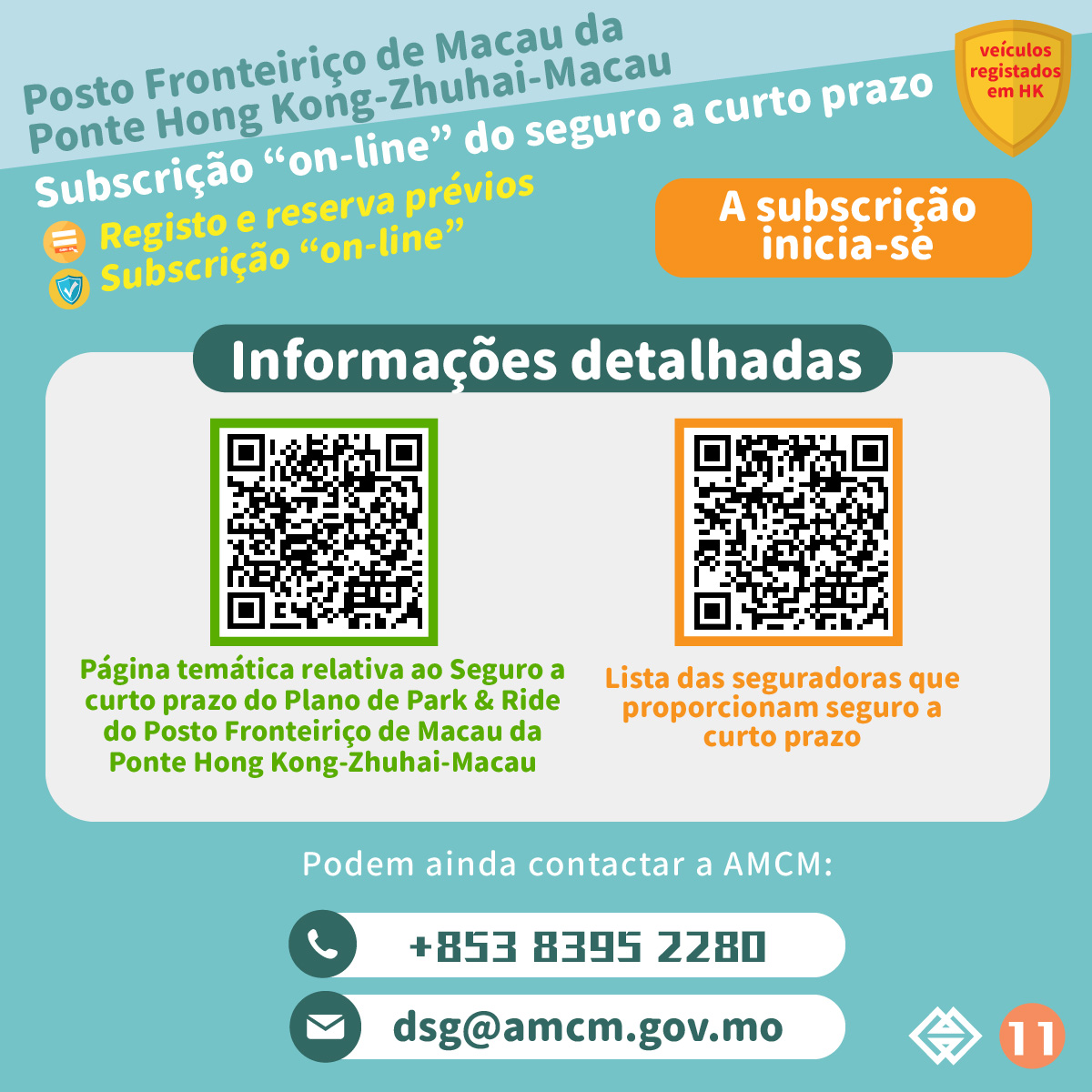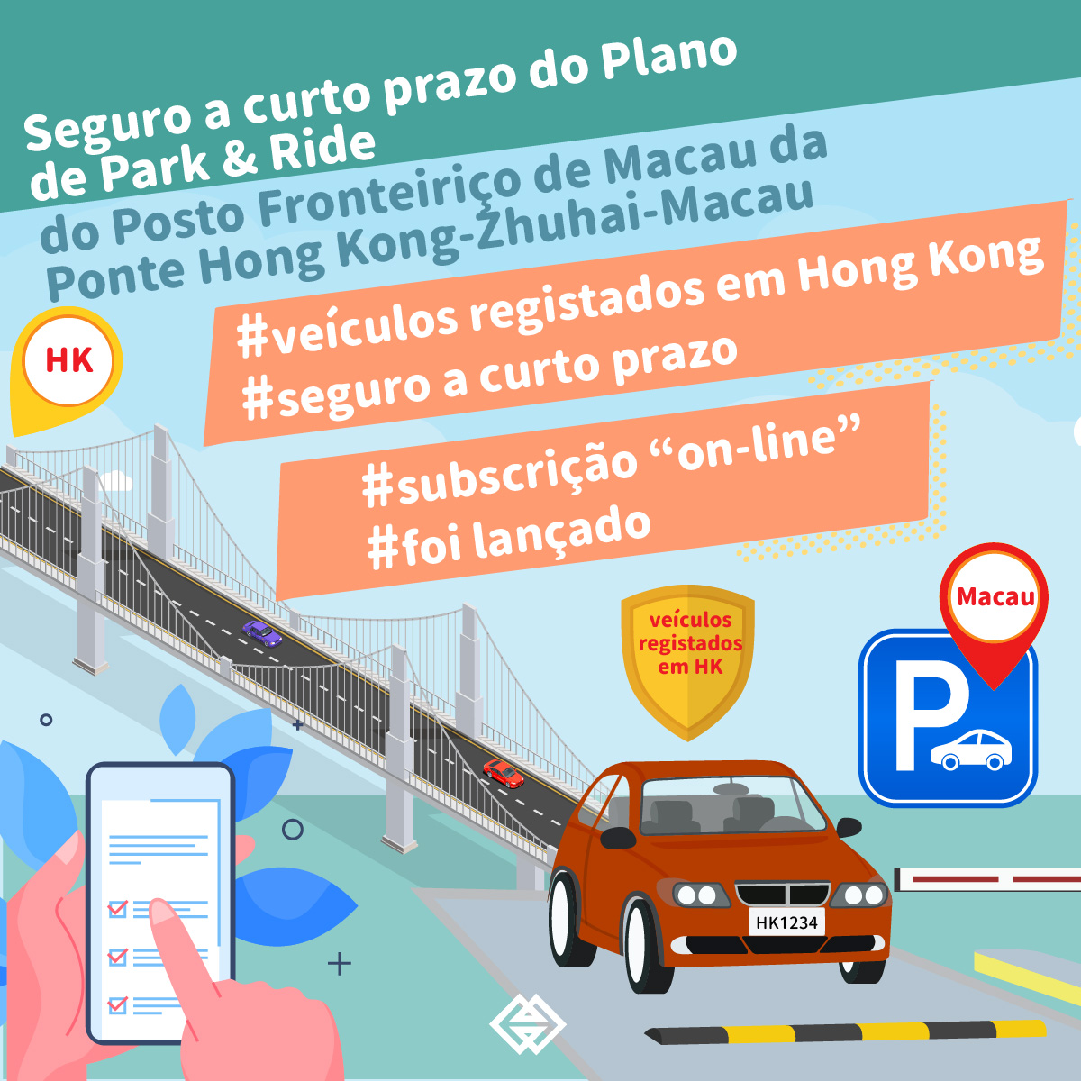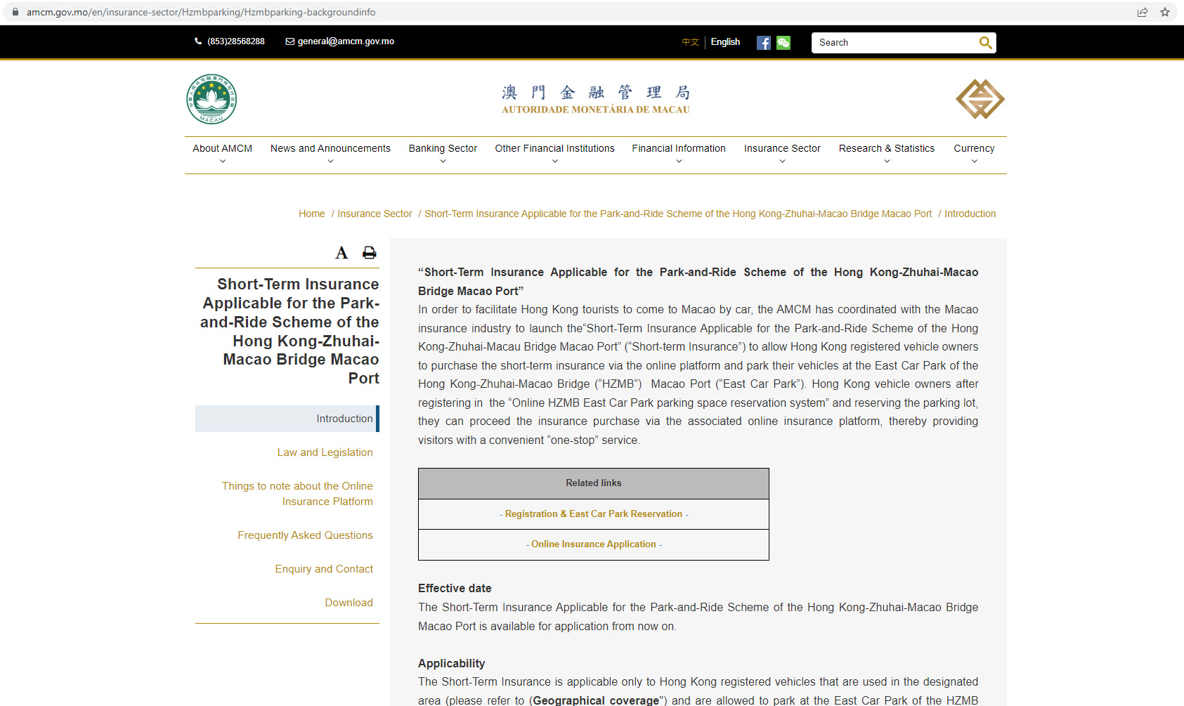 Com vista a facilitar os turistas de Hong Kong que se desloquem a Macau em automóvel ligeiro, a Autoridade Monetária de Macau (AMCM) coordenou com o sector segurador de Macau, o lançamento do “Seguro a curto prazo do Plano de Park & Ride do Posto Fronteiriço de Macau da Ponte Hong Kong-Zhuhai-Macau” (adiante designado por “seguro a curto prazo”), permitindo que os condutores de Hong Kong possam estacionar o seu veículo no Auto-Silo Este do Posto Fronteiriço da Ponte Hong Kong-Zhuhai-Macau, após a subscrição de seguro a curto prazo através da plataforma “online”.