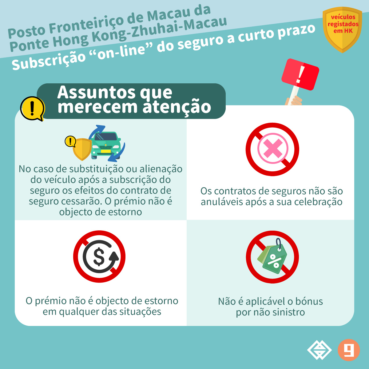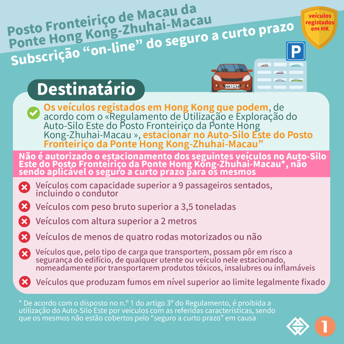 Os veículos registados em Hong Kong que circulam, de acordo com o «Regulamento de Utilização e Exploração do Auto-Silo Este do Posto Fronteiriço da Ponte Hong Kong-Zhuhai-Macau », nas áreas específicas da via pública, no auto-silo e nos corredores de passagem fronteiriça de migração, localizados no lado este do Posto Fronteiriço da Zona de Administração de Macau (sob a jurisdição de Macau) na Ilha Fronteiriça Artificial da Ponte Hong Kong-Zhuhai-Macau podem subscrever o seguro a curto prazo, de modo a obter cobertura para danos causados a terceiros ou responsabilidade civil de danos causados.