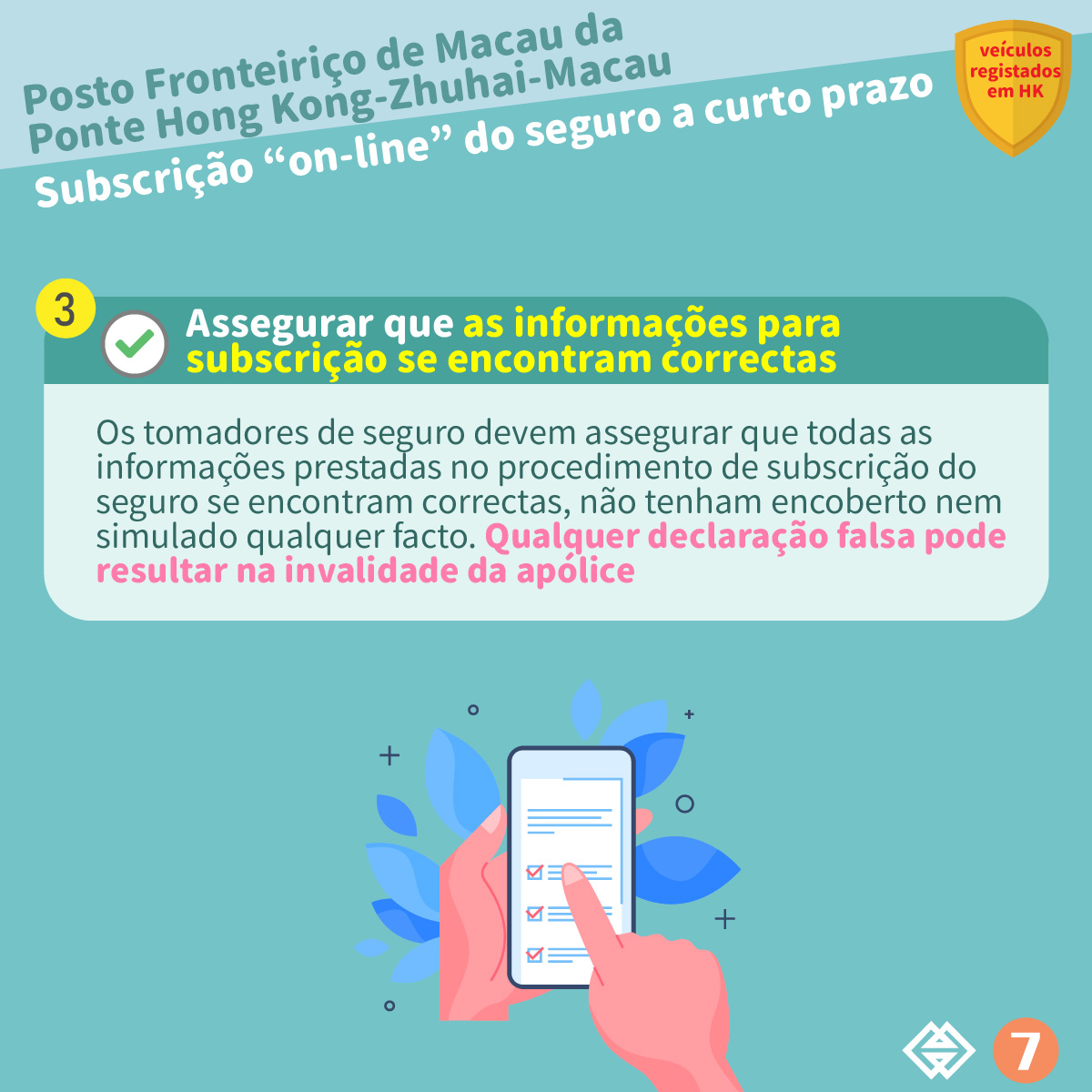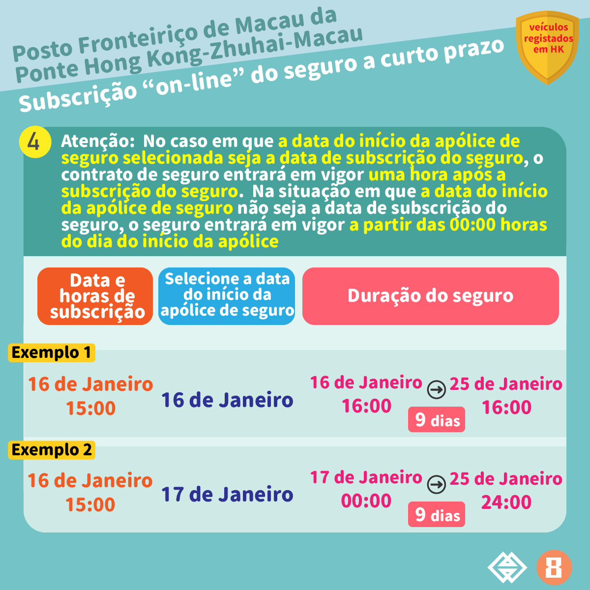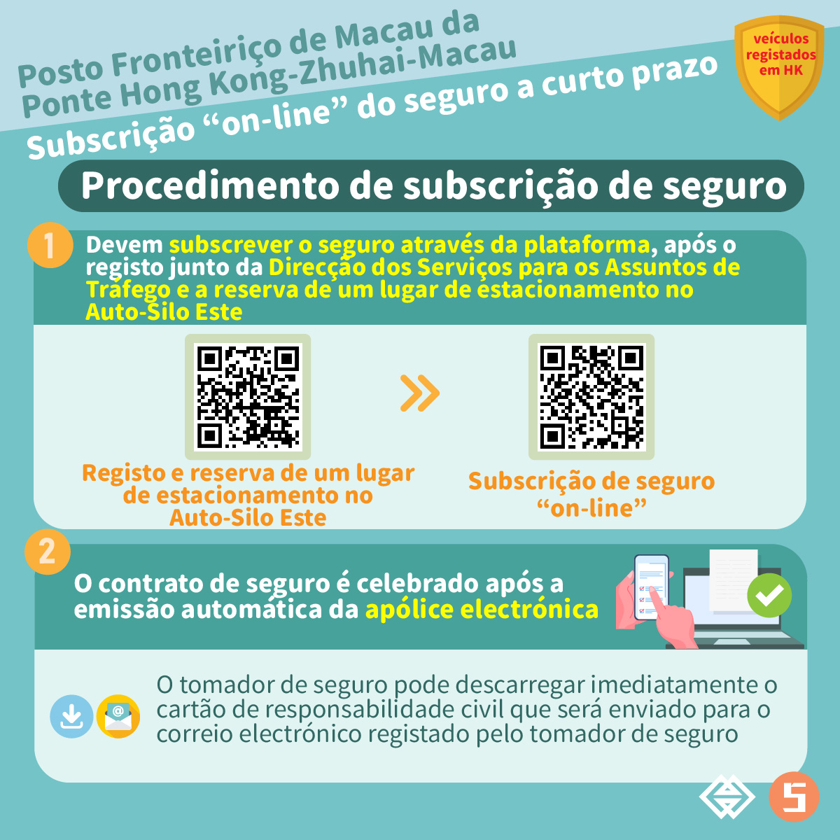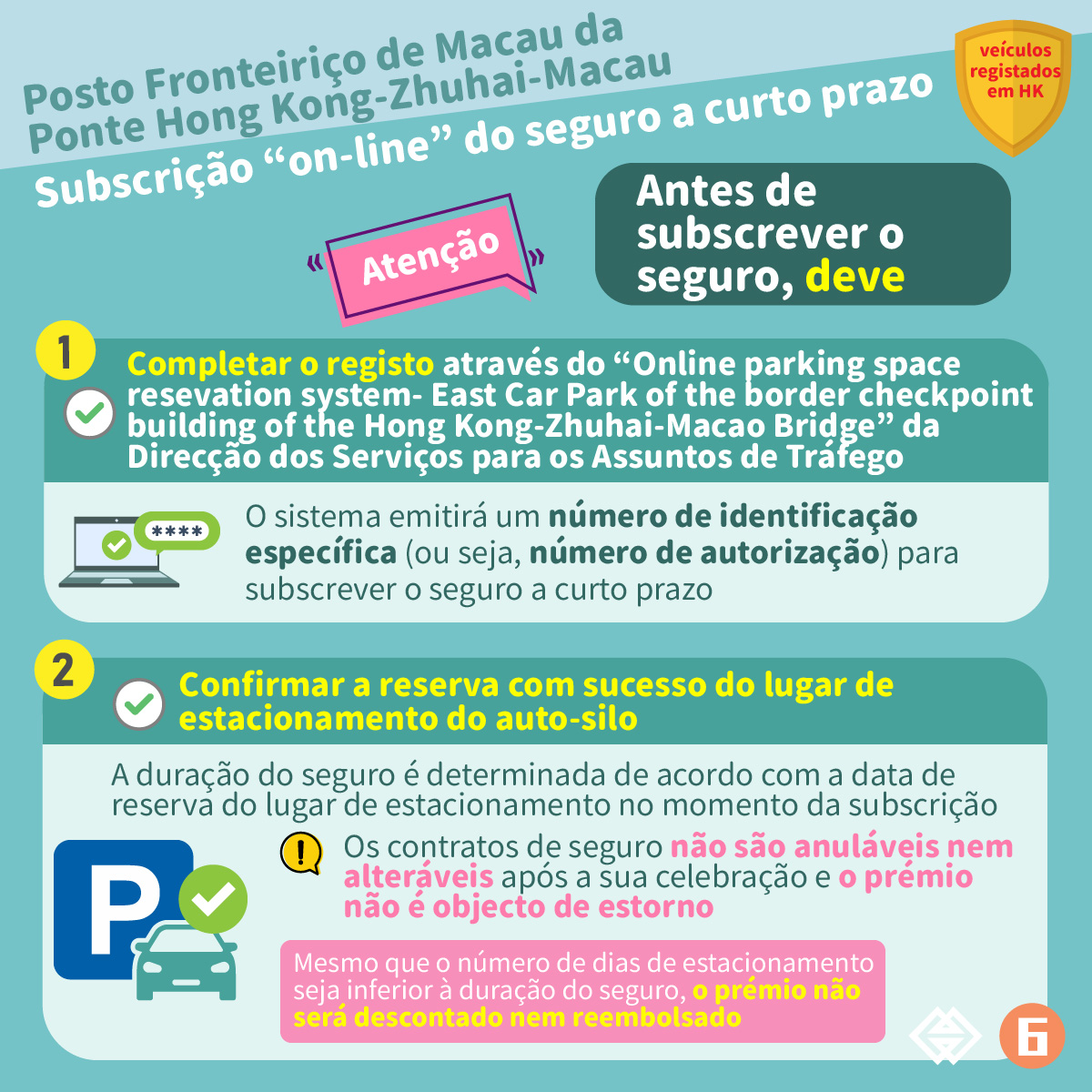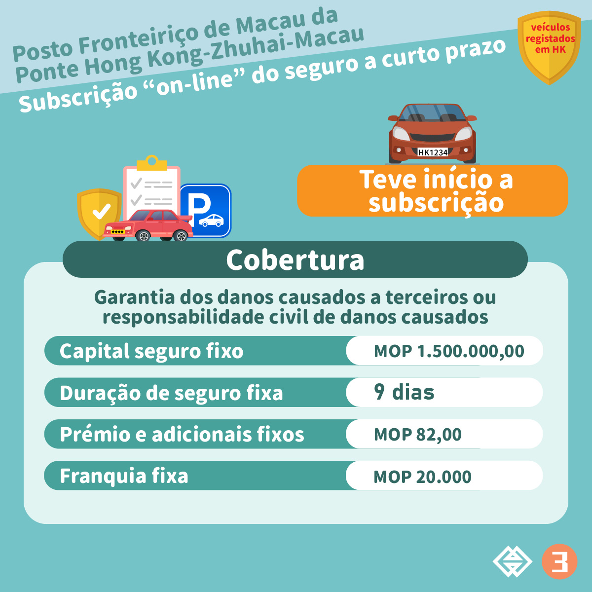 Assim que os proprietários de veículos registados em Hong Kong completem o registo através do “Online parking space reservation system- East Car Park of the border checkpoint building of the Hong Kong-Zhuhai-Macao Bridge” da Direcção dos Serviços para os Assuntos de Tráfego e reservem com sucesso um lugar de estacionamento no Auto-Silo Este do Posto Fronteiriço da Ponte Hong Kong-Zhuhai-Macau, os mesmos podem subscrever o seguro a curto prazo com uma duração de 9 dias junto das seguradoras de Macau que participam no plano em causa através de auto ligação à plataforma de subscrição de seguro. A plataforma de subscrição de seguro inciou o seu funcionamento a partir das 18 horas do dia 30 de Dezembro de 2022.