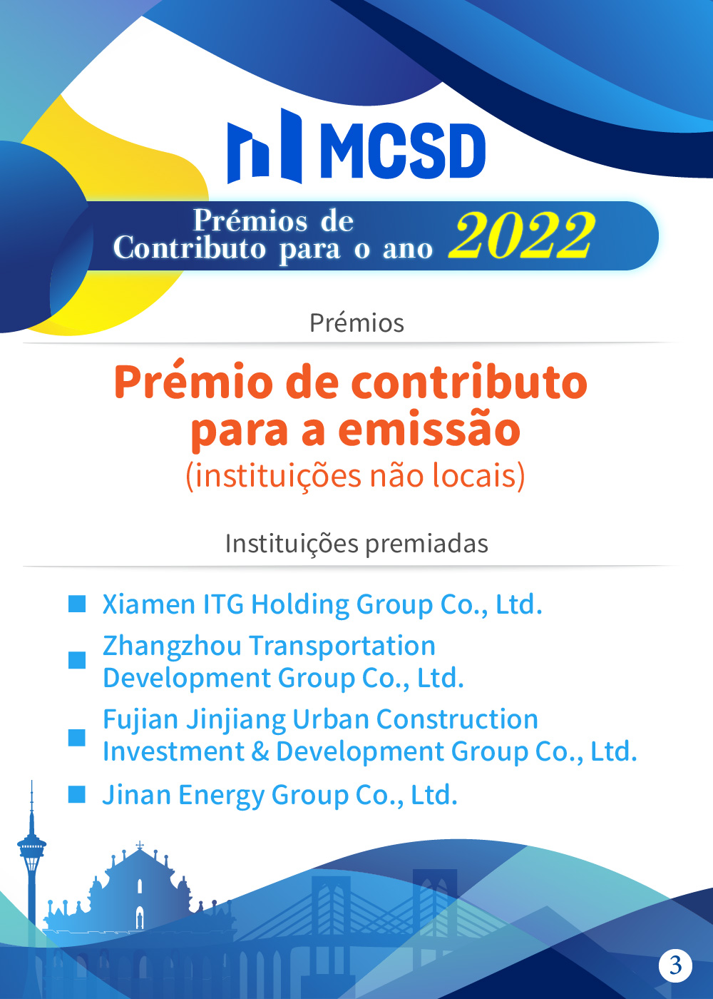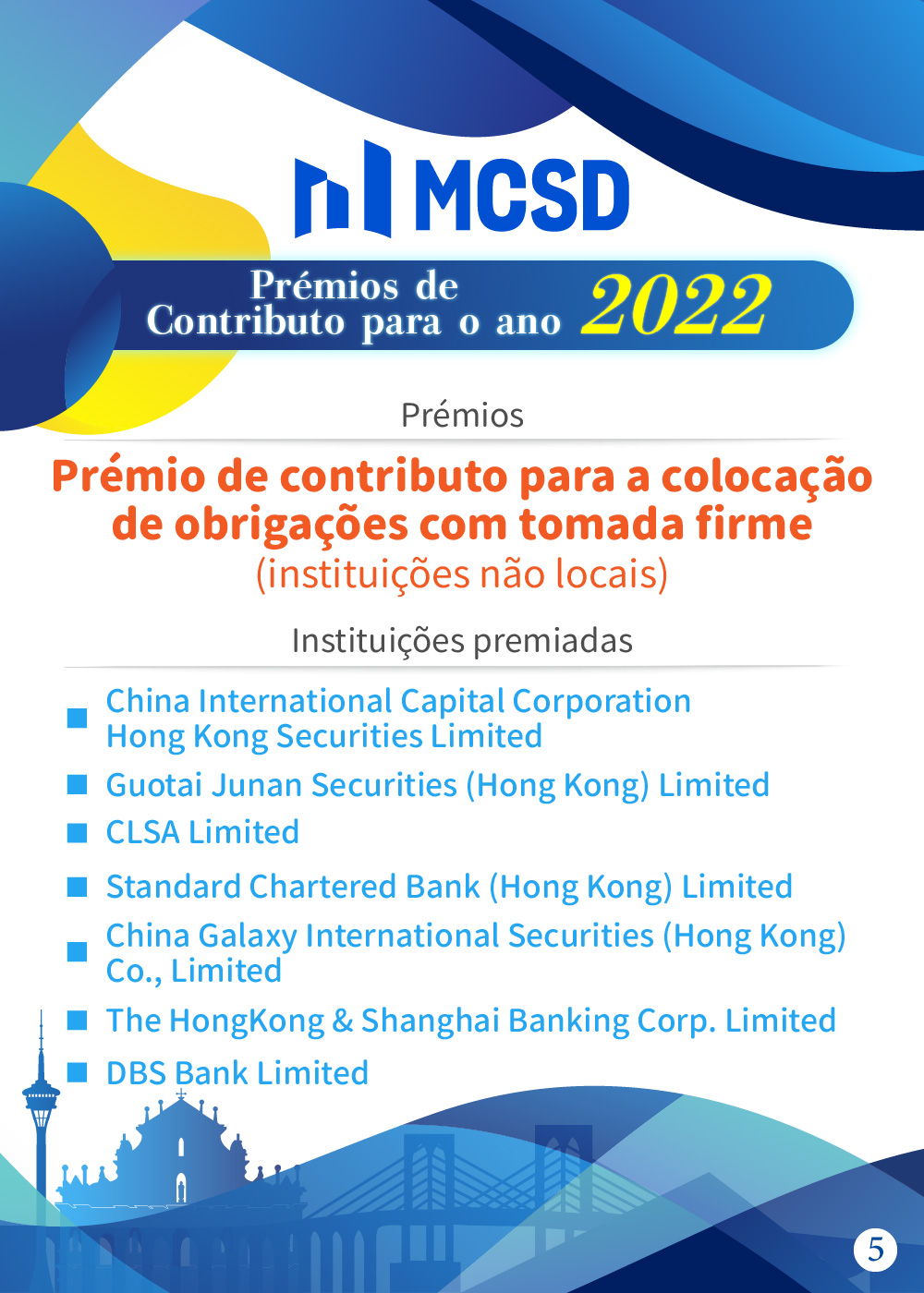 A Autoridade Monetária de Macau e a Central de Depósito e Liquidação de Valores Mobiliários de Macau Sociedade Unipessoal Limitada (MCSD) organizaram um evento com o objectivo de comemorar o primeiro aniversário da MCSD, tendo contado com a presença do Exmo. Senhor Chefe do Executivo, Dr. Ho Iat Seng e de outros convidados. Neste evento, foram atribuídos vários prémios, de modo a homenagear os participantes no mercado, que contribuíram para o mercado de obrigações de Macau em 2022, tendo sido atribuídos prémios a 25 instituições locais e estrangeiras.