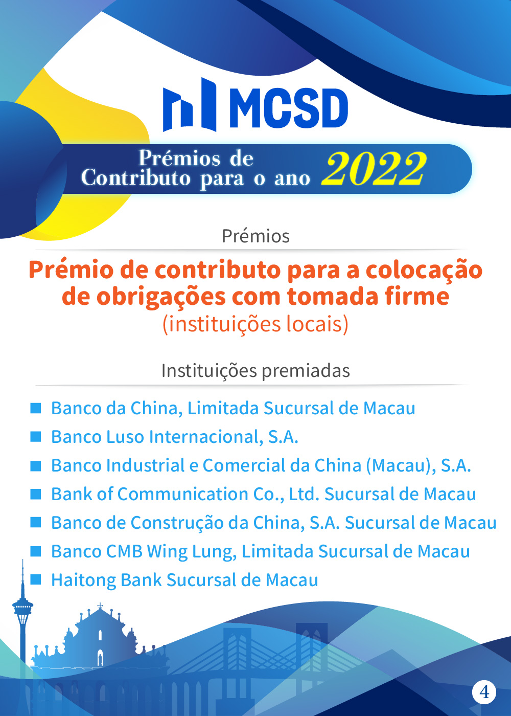 Com vista a elogiar e reconhecer o contributo significativo dos participantes para o mercado obrigacionista de Macau em 2022, foram atribuídos, neste evento, prémios em quatro categorias, nomeadamente: "Parceiro de excelência no mercado ", "Prémio de contributo para a emissão", "Prémio de contributo para a colocação de obrigações com tomada firme" e "Plataforma de serviços de excelência no mercado", tendo sido premiadas 25 instituições locais e estrangeiras.
