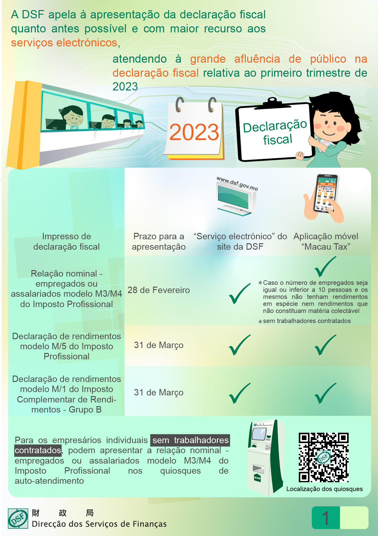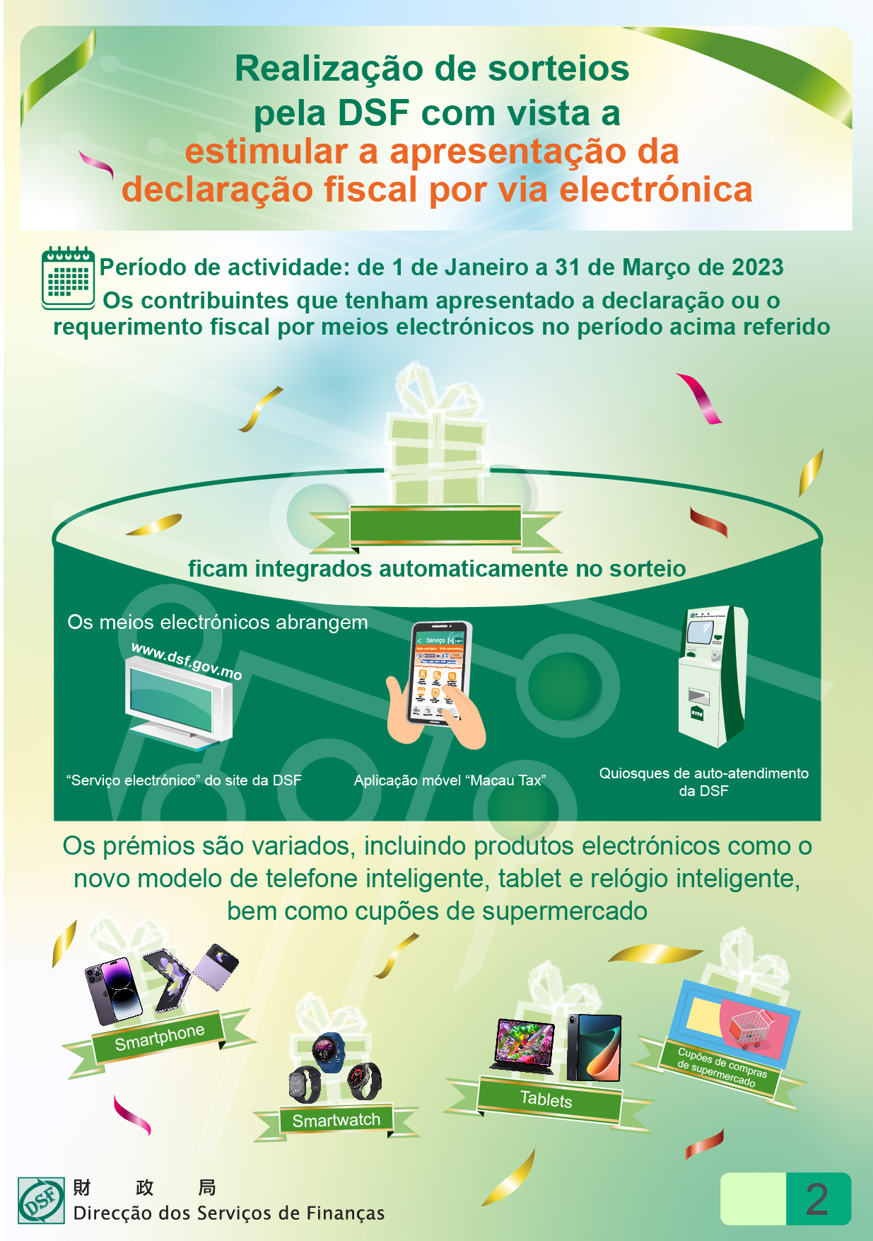 Atendendo ao maior afluência de público na apresentação da declaração fiscal relativa ao primeiro trimestre, a DSF promove, em especial, sorteios no âmbito da declaração electrónica, visando incentivar a apresentação da declaração fiscal online ou via telemóvel ou quiosque de auto-atendimento por parte dos contribuintes, sendo os mesmos considerados automaticamente como participantes nesta actividade, desde que a entrega da declaração, ou do requerimento fiscal, por meios electrónicos, seja efectuada entre 1 de Janeiro e 31 de Março de 2023.
