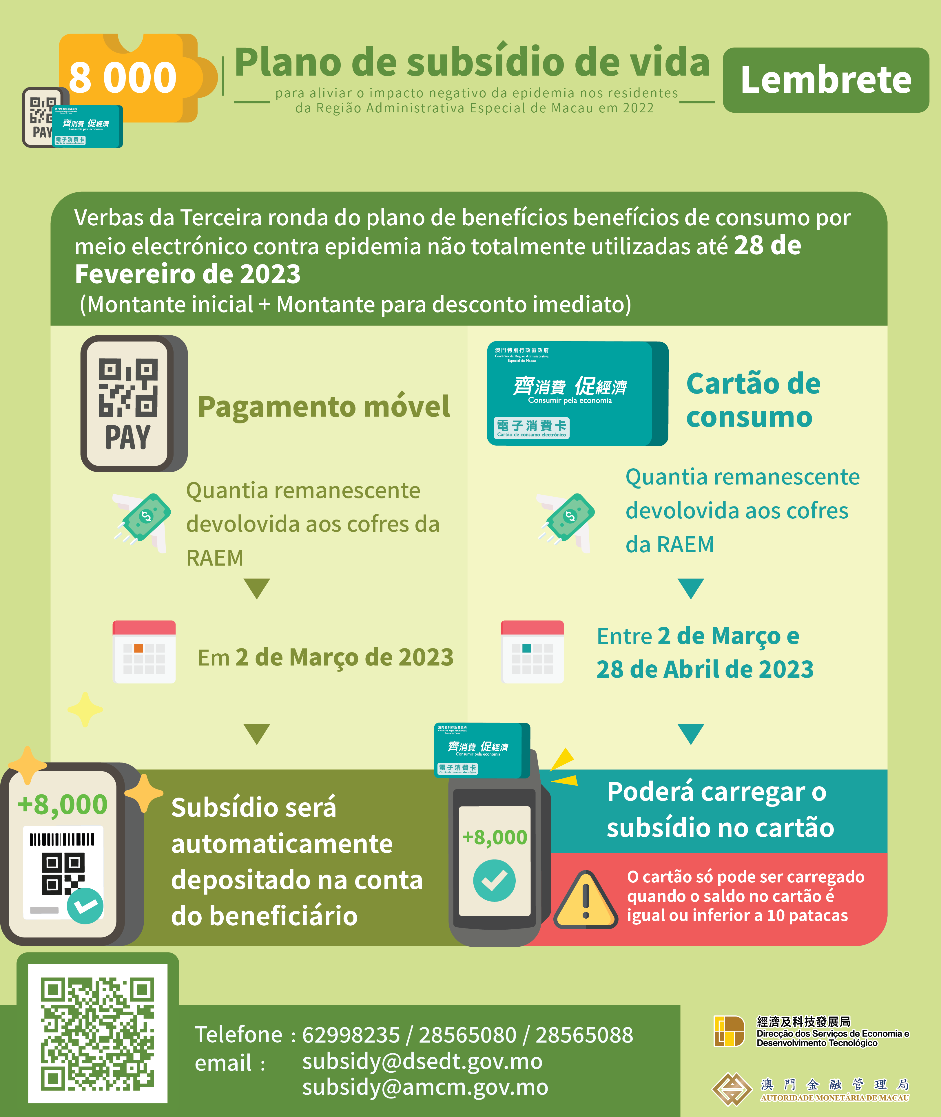 Havendo dúvidas sobre a “Terceira ronda do Plano de benefícios de consumo por meio electrónico contra a epidemia” ou “Plano de subsídio de vida”, poderão os residentes visitar as páginas exclusivas dos planos ( https://www.dsedt.gov.mo/econsumo/pt/index.jsp ) ou ( https://www.dsedt.gov.mo/subsidy/pt/index.jsp ), ou solicitar informações, durante o horário de expediente, através dos seguintes meios:
